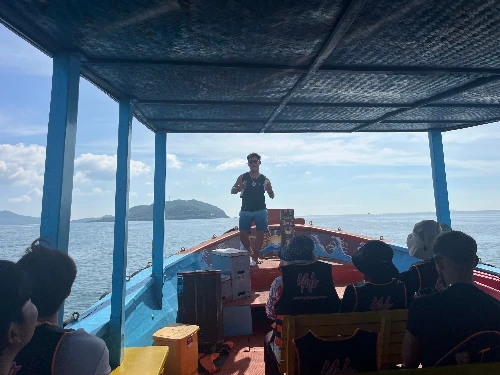 자그마한 체구인 ‘푹’씨는 구릿빛 얼굴, 카랑카랑한 목소리로 승객들을 압도했다. 한국 사람보다 K팝에 해박했고 유창한 영어와 뛰어난 팝송 실력으로 젊은 유럽여행객들과도 잘 어울렸다. 파도로 요동치는 뱃머리에서 쉼 없이 마시고 부르고, 이야기하는 모습에서 진정한 열정이 느껴졌다. 잠수구를 쓰고 해저를 걷는 seawalking, 배 이층에서 맨몸으로 뛰어든 에메랄드 바다, 선상 락밴드, 언제 어디서나 영어 하나로 친구가 되는 서양인들, 오랜만에 구속을 벗은 우리나라 엄마들의 노래와 춤 자랑까지 즐거운 하루였다.