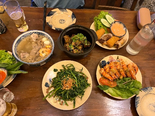 베트남 음식은 우리나라에 비해 양이 적다. 성장기도 아니건만 밀려드는 헛헛함에 두 번째 식당을 찾았다. ChaoMao1은 사 층 높이 미니멀한 내부 장식이 홍대 어느 괜찮은 음식점 분위기였다. 층마다 가득한 사람들 식사가 끝나기까지 맥주 한 잔을 시켜놓고 느긋하게 기다렸다. 삼십 분쯤 후 자리로 안내받아 돼지갈비, 볶음밥과 면을 주문했다. 점심과 비슷한 메뉴였으나 질과 양이 훨씬 만족스러웠다. 끝맛이 밍밍한 맥주에 진한 누룽지 향이 나는 베트남 보드카 넵모이를 섞은 맛도 새로웠다.