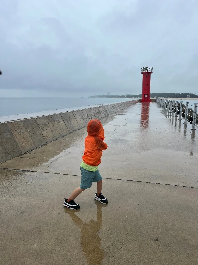 서울 사람 서울 구경하지 않는다는 말처럼 동네가 어떻게 생겼는지 알지 못했다. 자주 가는 마트나 음식점 한두 군데만 알았을 뿐. 멀리 가기 어려운 날씨, 여행이 시들해진 지금에야 가까운 곳 둘러볼 생각이 들었다. 우산 쓰고 언덕에 있는 나 홀로 아파트를 지나 밭과 밭 사이 샛길을 걸었다. 바닷가에서 얼마 떨어지지 않았으나 산골짜기에 있는 느낌이었다. 도로에서 떨어진 작은 숲이 있는 이쪽 숙소에 묵었다면 지금까지와 다른 전원생활일 듯했다. 해안도로를 따라가는 길 텐트 야영을 했던 연곡해변이 보였다. 오늘 저녁 역시 그곳에서 보낼까 하다 즐기는 시간에 비해 번거로운 게 많아 그만두었다. 반대편 영진해변 방파제 끝으로 등대가 눈에 들어왔다. 몇 번 낚시한 곳이라는 말에 호기심 생긴 아내와 함께 가까이 갔다. 등대는 모두 왜 빨간색일까? 청회색 하늘과 바다 가운데 가장 두드러지는 색깔이기 때문인지 모른다.