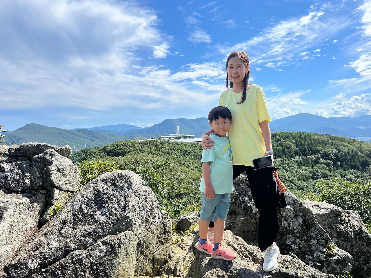 좁은 숲길은 양옆으로 종비나무가 하늘을 가리며 자랐다. 처음 맡은 청량한 냄새에 머리와 마음이 상쾌했다. 그리 길지 않은 아쉬움을 뒤로하고 다시 이십 분을 걸었다. 드디어 마주친 전망대. 아기자기한 강릉 시내와 경포호수는 물론 동해가 멀리까지 보였다. 양옆으로 안반데기와 오대산까지 모두 우리가 지나친 길이 한자리에 있었다. 불평하던 아이는 마주한 풍경을 받아들이며 즐거워했다. 내려가기 전 세 식구는 구름 없는 맑은 하늘과 함께 선자령을 선명하게 담았다.