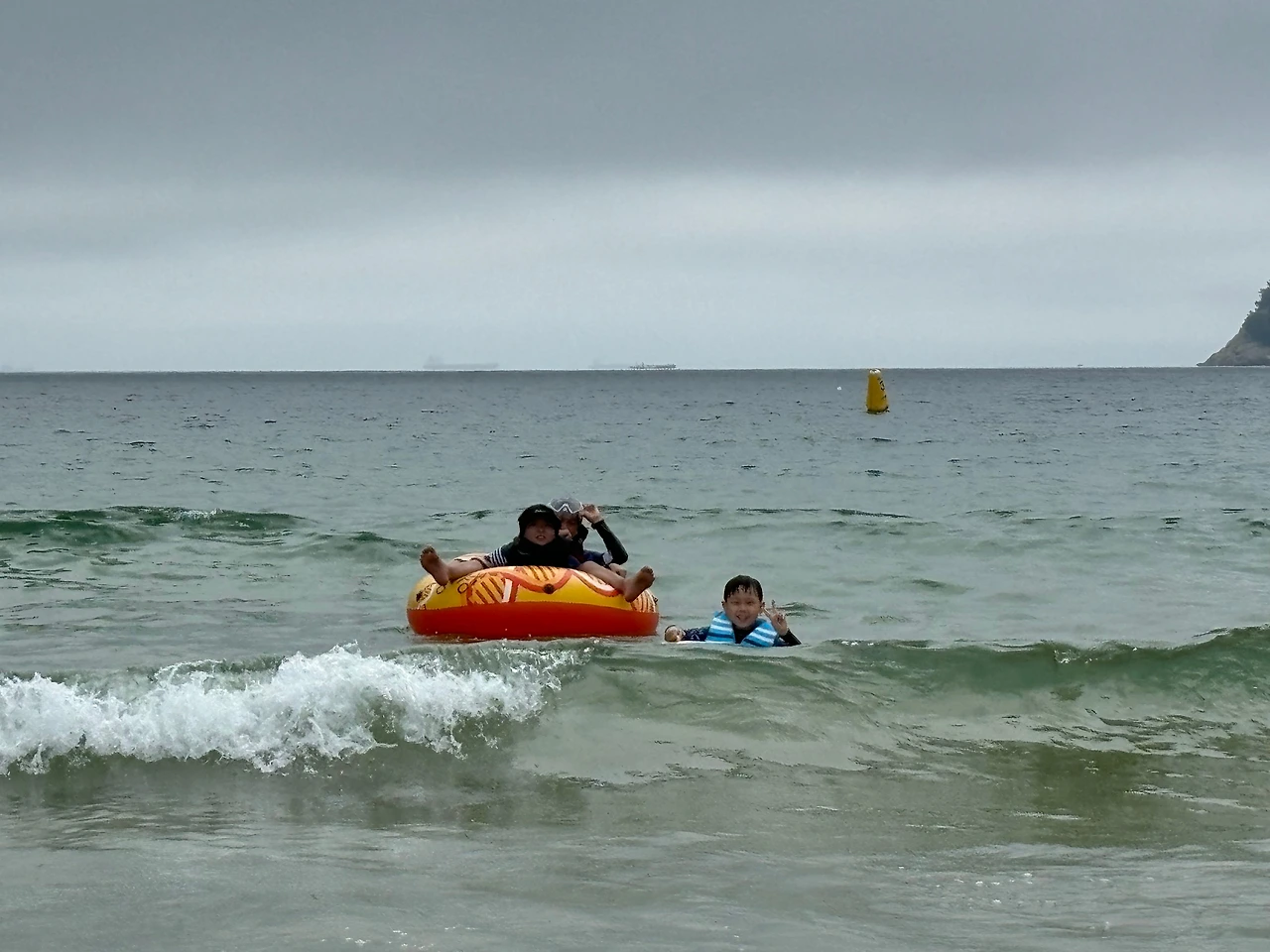 목이 아파 음식 삼키기 힘들어하는 아이를 데리고 근처 병원에 갔다. 목 안이 많이 부었다는 의사 소견, 서울에서도 달에 한 번은 감기로 고생했는데 안타까울 따름이다. 그 사이 조카 둘은 바다에 들어갈 준비를 마쳤다. 바닷물에서 모래사장, 다시 그 반대로 번갈아 달려가는 장면을 가까이서 영상으로 남겼다. 장마가 완전히 가시지 않아 여전히 거칠고 혼탁한 파도였으나 바다 자체가 행복한 듯 두 팔을 뻗어 가슴에 담뿍 안았다. 그렇게 온몸으로 기쁨을 발산한 채 시원한 바다로 뛰어들었다. 반면 발만 담근 채 바다를 바라보는 아이는 뭔가 아쉬운 표정이다.