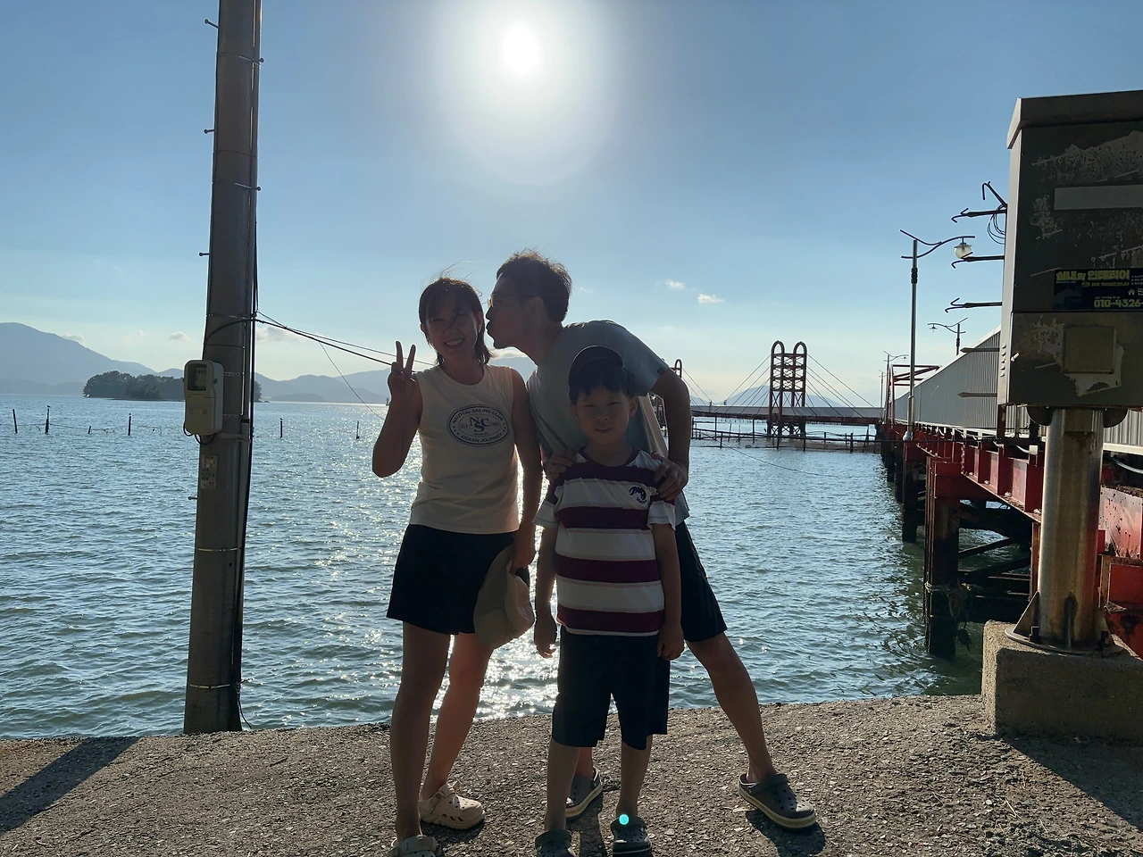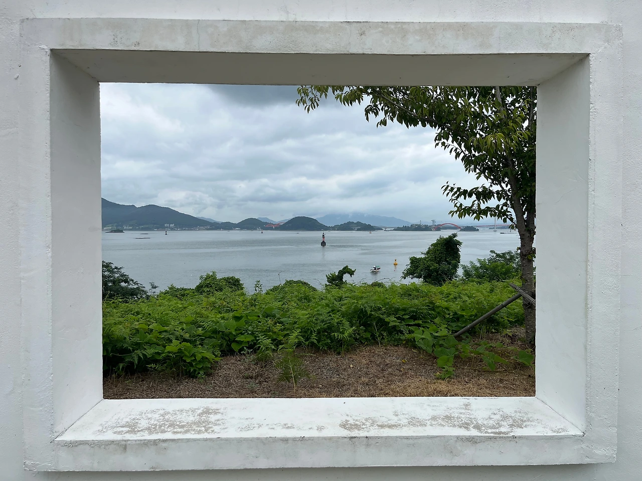 구름 낀 하늘, 짧은 전망대 길로 갔다. 신수항 마을 뒤 능선을 따라 난 콘크리트 포장도로 양옆 언덕에는 고사리와 고구마가 심어졌고 드러난 누런빛 흙과 잔돌이 척박한 섬 환경을 말해주었다. 오르막길 꼭대기에 긴 의자가 하나 있었다. 아까부터 걷기 힘겨워했던 두 사람 볼멘소리를 모른 체 했으나 더 그럴 수 없었다. 식당이 하나도 없어 의자에서 잠시 쉬며 싸간 음식으로 요기했다. 전망대는 십 분 정도 더 가야 한다. 언덕을 내려가 작은 몽돌해변에 아이와 아내를 두고 혼자 천천히 오른 그곳에는 이국적인 하얀 액자 구조물과 정자가 어울린 듯 그렇지 않은 듯 함께 있었다. 앞으로 다가갔다. 경계 너머로 멀리서는 보지 못했던 바다 위 빨간 등대와 멀리 녹색 빛 섬이 함께 나타났다. 마치 잘 그린 풍경화처럼. 등 뒤 삼천포 화력발전소 역시 자연의 일부였다.