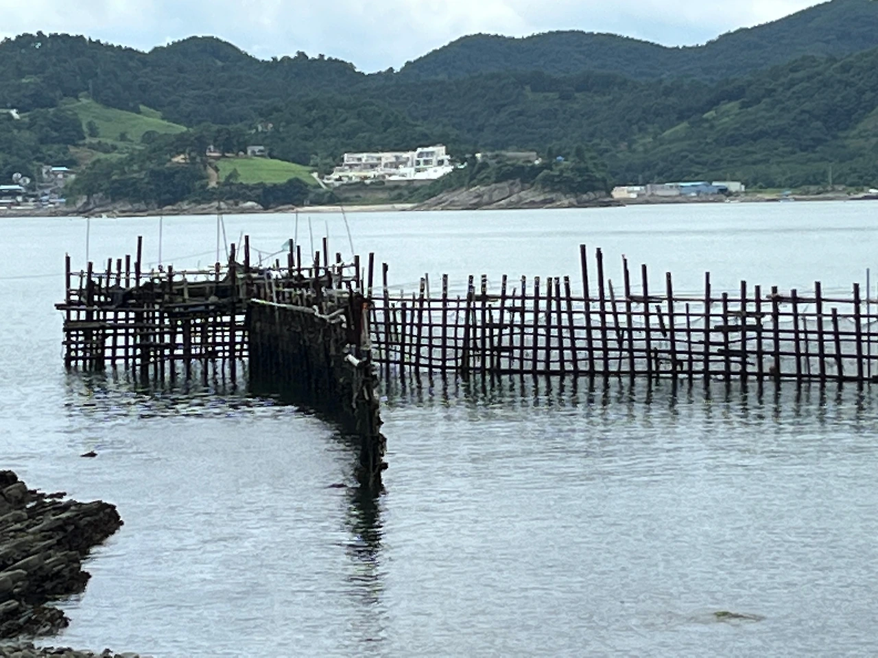 그리 멀지 않은 곳에 죽방렴이 있었다. 모양이 어림 짐작되는 위치까지 썰물에 드러난 몽돌해변을 따라 걸었다. 일렬로 참나무 세운 기둥에 대나무로 그물을 엮어 만든 전통 어구는 ‘V’ 자 모양이다. 꺾인 쪽 끝에 작고 둥그런 공간이 있고 여닫이문 달렸다. 썰물 때 닫힌 공간 안쪽으로 그득히 잡힌 멸치는 온전한 비늘 덕에 상품성이 높다. 좀 더 곁에서 자세히 보고 싶었으나 남은 건 이제 한 시간 정도.
