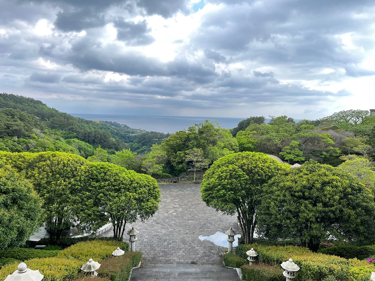 중문에 있는 천제연폭포로 갔다. 폭포는 모두 세 개로 되어 있다. 가장 상류의 제1폭포는 물이 떨어지는 면 절벽이 주상절리. 육각형의 벌집 모양 돌기둥이 거꾸로 매달려 있는 듯 언제 봐도 신기하다. 제2폭포는 무성한 나무 사이로 수려한 수묵화를 닮았다. 가장 하류에 있는 제3폭포는 멀고 내리막 계단이 많다. 둘은 주저했으나 꼭 가고 싶다는 내 말에 마지못해 따라나섰다. 힘든 것은 잠시, 비경이 펼쳐졌다. 초목과 덩굴로 녹음이 짙은 나무 탐방로와 그 옆에 돌을 파서 만든 관개시설이 있었다. 제1폭포에서 바닷가 농토까지 이 킬로미터 가량 마치 자연적으로 생성된 듯 산책로 절반 정도 폭에 깊은 곳은 종아리 높이까지 물이 흘렀다. 구한말인 1906년부터 삼 년간 오롯이 사람의 정과 망치질로 만들었다는 설명에 나도 모르게 고개가 숙여졌다. 제3폭포를 보고 돌아오며 천제루로 이어지는 선임교로 갔다. 칠십 미터가 넘는 아찔한 계곡 위 아치형 공중다리에 서니 하늘에 뜬 느낌이었다. 건너편이 가려지도록 가운데가 크게 볼록한 모양이 의아했으나 오작교를 상상하며 만들었다는 말이었다. 잠시 더위를 식히려 천제루에 올랐다. 중문 멀리까지 전체가 보이는 위치.