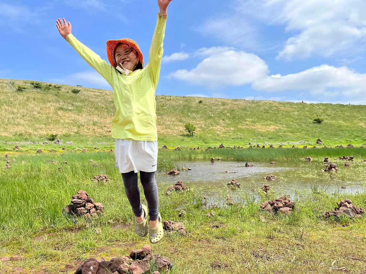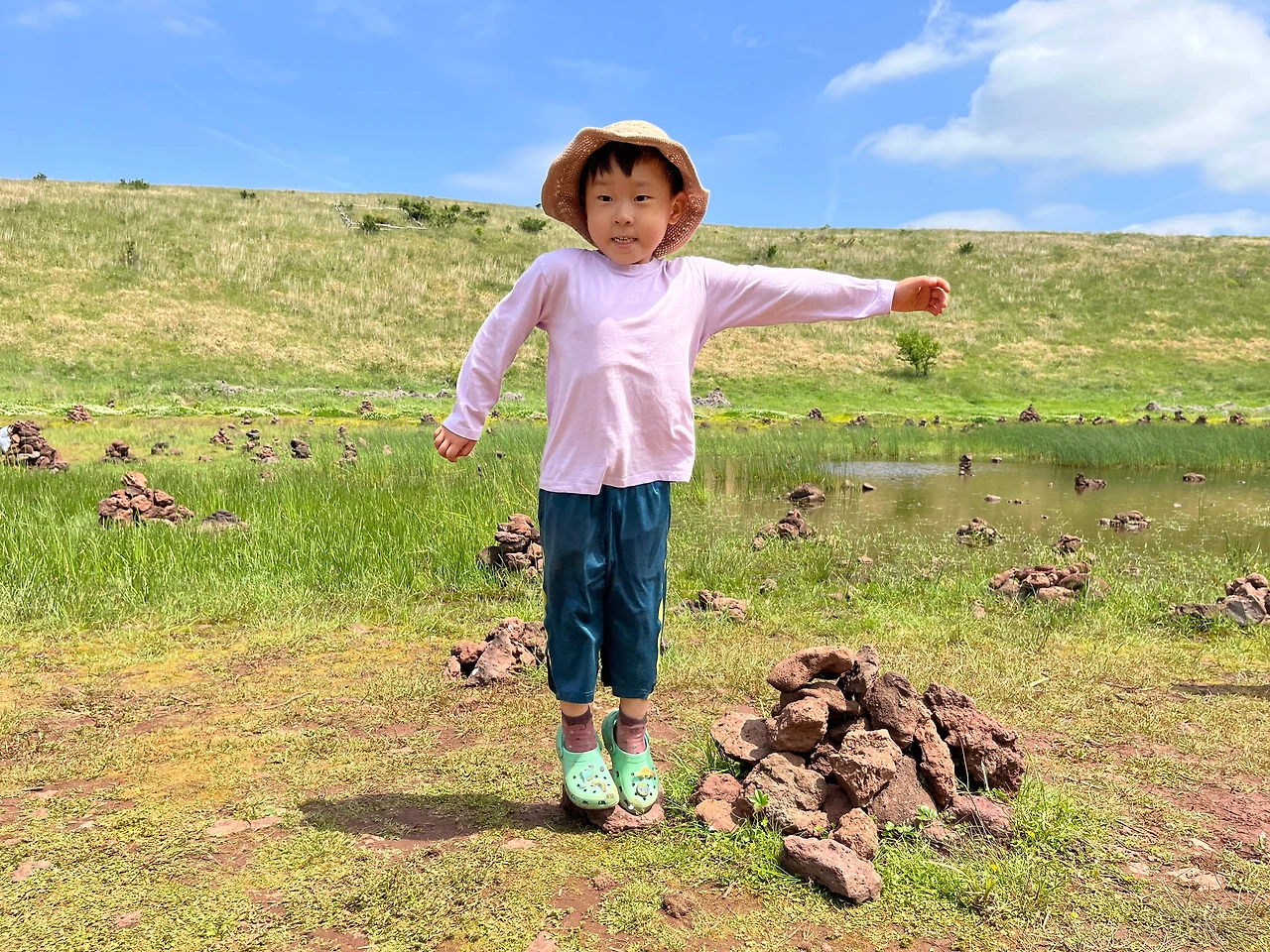 금오름은 분화구 모양이다. 중간에 호가 있어 작은 한라산이라는 별명이 붙었다. 통신탑이 있는 가장 높은 곳까지 올랐다가 호로 내려갔다. 이곳에서 가장 좋은 경치. 다만 지난번보다 감흥이 덜했다. 물이 줄고 바람이 잦아든 데다 처음이 아닌 탓도 있다. 그래도 산 한가운데 갈대와 돌로 쌓은 작은 탑, 철새 몇 마리가 공존하는 건 다시 봐도 새로웠다. 한참을 서 있다가 내려온 반대편 꼭대기로 올라가 넓은 평상에 앉았다. 앞쪽은 한림 바다와 마을, 등 뒤로는 호와 처음 올랐던 정상, 아름다운 자연에 폭 안겼다. 꼬마들 역시 분위기에 취해 가파도에서처럼 스스로 춤을 추었다.