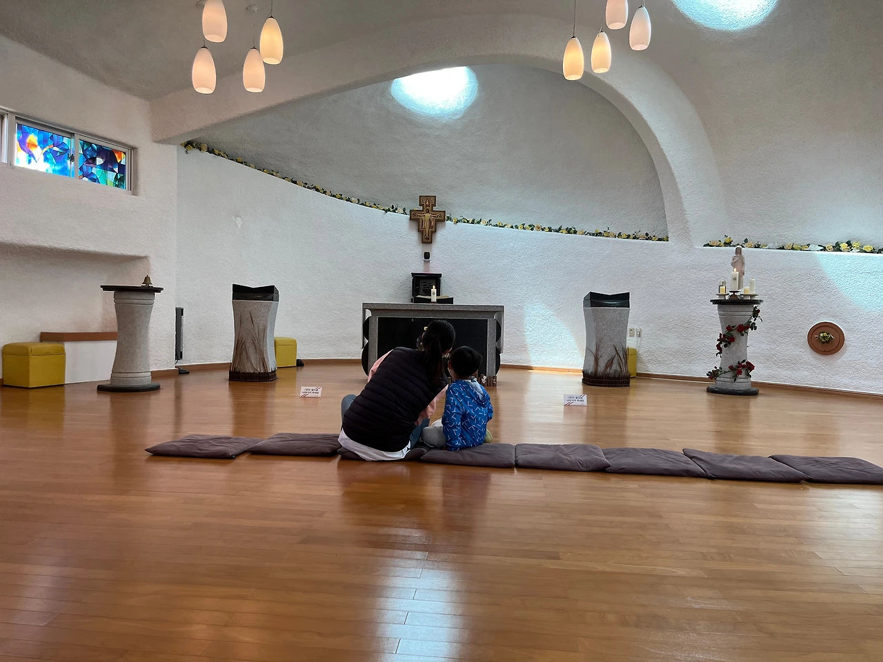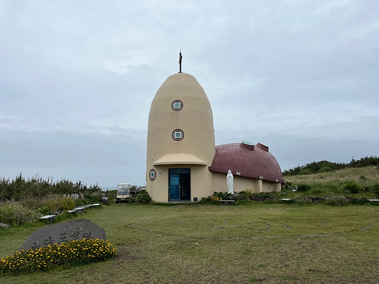고구마 모양의 길쭉한 섬은 가장 긴 곳이 1km 남짓이고 둘레는 대부분이 절벽이다. 길을 따라 해안가를 둘러보다가 서쪽에 배가 접안 한 작은 부두가 보였다. 그 근처가 비교적 바다와 가까워 가파도처럼 갯바위 체험을 위해 내려갔으나 파도가 세고 물가로 가기에는 높아 금방 올라왔다. 좀 더 남쪽으로 가니 절이 한 채 나왔다. 최근에 지어진 듯 고풍스러운 멋은 없었으나 대웅전에서 바라본 바다 풍경이 좋았다. 쉬어가자는 아이의 말에 잠깐 앉았다. 편안하고 조용한 분위기, 좁은 천정에는 천 개도 넘는 소원 비는 등이 달렸다. 그 많은 사람이 먼 곳까지 찾아왔다는 데 감탄했다. 길 좀 더 아래쪽에 대한민국최남단비와 장군바위를 넘어가니 멀리 야트막한 언덕 위 이국적인 건물이 보였다. 지도에는 성당이라 표시되었다. 전체는 거북이 모양으로 제주도 특유의 방사탑을 닮은 종탑 곁에 등껍질처럼 생긴 예배당이 붙어 있다. 겉은 베이지색과 옅은 팥색으로 칠해져 주변에 어울렸고 작은 크기가 아기자기했다. 안에 들어가 앉았다. 벽면의 스테인드글라스를 통해 파란빛이 스며들었고 천장의 둥근 보가 비대칭인 모습이 독특했다. 마라도는 멋진 카페는 없으나, 절과 성당에서 독특한 분위기를 느끼며 쉬어갈 수 있었다.