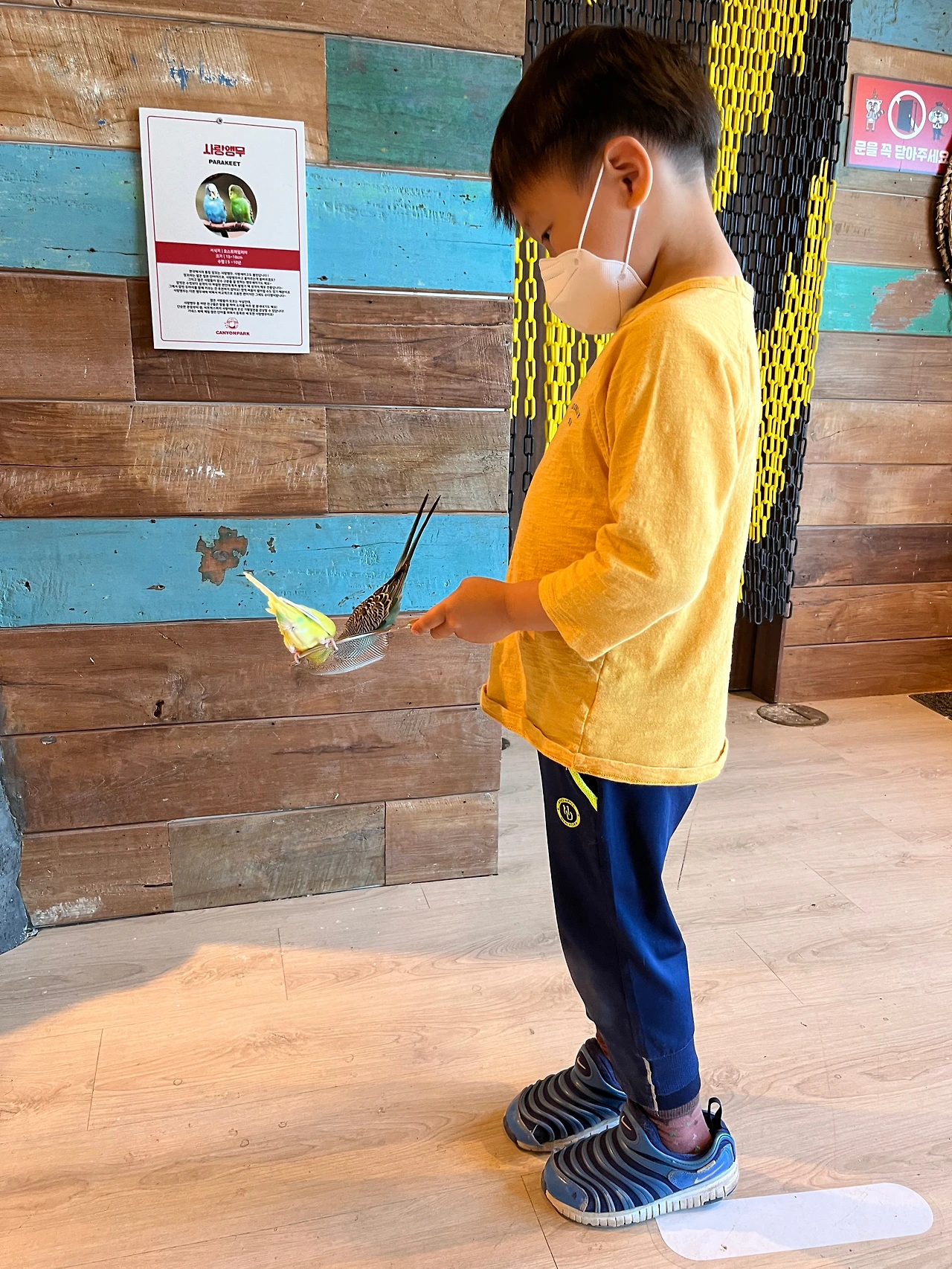 제주 시내 있는 일 층부터 삼 층까지 규모 실내 동물원에는 뱀과 도마뱀, 카멜레온, 수달, 양, 미어캣, 여우, 새 등 다양했다. 아이가 정작 관심을 가진 건 사막여우 대신 먹이 체험이 가능한 동물들이었다. 양, 수달, 유기된 고양이. 그중에서 잘생긴 외모에 친근하게 다가온 고양이를 가장 좋아했다. 아내와 키우다 처남 집으로 보낸 지금 열여섯 살인 고양이가 아직 집에 있다면 둘은 좋은 친구가 됐을 텐데. 한 층 위에 있는 사랑앵무가 가득한 방으로 갔다. 씨앗을 먹이로 들이밀자 두려움 없이 손 위로 날아와 딱딱한 부리로 쪼아댔다. 어깨와 머리에도 앉는 모습에 좀 무서운 듯 울상 지으며 익숙해지려 버텼다. 일 층으로 내려오니 깊지 않은 카약 체험장이 있었다. 지나치려 했으나 조르는 눈빛을 외면할 수 없어 노를 들고 앉았다. 오랜만에 하는 서툰 노 젓기에 방향 잃은 배가 이리저리 돌고 물이 튀어 엉덩이가 다 젖었다. 언짢은 아비와 달리 느긋하게 모형 물고기잡이를 즐겼다.