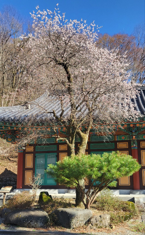 칠불사 입구 주차장에 도착하니, 목련나무가 하얀 꽃을 가득 품은 채 반겼다. 그 옆에는 연분홍 살구꽃이 수줍게 피어 있었다. 돌계단을 오르다 잠시 앉아 그 풍경을 바라보았다. 이 또한 봄의 또 다른 얼굴이었다.