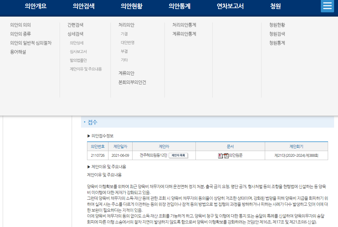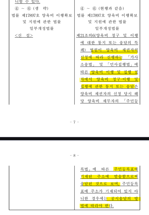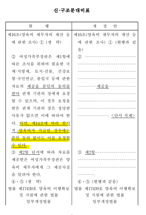 이에 양육비 채무자의 동의 없이도 소득·재산 조회를 가능하게 하고, 양육비 청구 및 이행에 대한 통지 또는 송달의 특례를 신설하여 양육의무자의 송달 회피에 따른 이행 소송에서의 절차 지연이 발생하지 않도록 함으로써 양육비 이행확보를 강화하려는 것임(안 제16조, 제17조 및 제21조의6 신설).