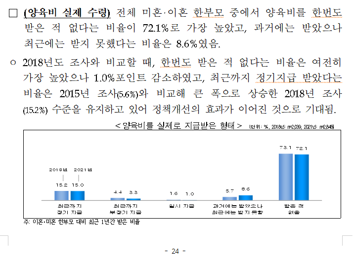 2015년 - 2018년 - 2021년 조사에서 정기지급 받았다는 비율이 큰 폭으로 올라 유지되고 있다 하니 뭐 그런가보다 하는데.. 그 사이 아이가 있는 부부의 이혼비율도 같이 대폭 올랐으니, 이건 좀 살펴봐야 하지 않나 싶다.