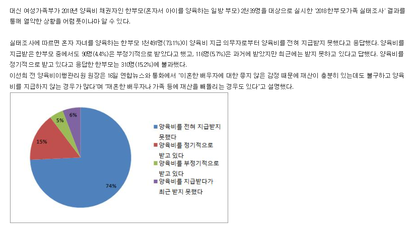하지만 조금만 더 시야를 넓혀주기 바란다. 내 아이의 친구가, 미래의 내 사위나 며느리가 양육비로 고통받던 과거를 가지게 될 수 있다. 내 가족이, 내 친구가 또 어쩌면 내가 이 상황에 놓이게 될 수 도 있다. 그랬을때 개인의 실수와 부족함 그리고 양육비를 안줘야지 하는 개같은 마음을 깨버릴 수 있는 법제도가 확립되길 간절히 바란다.