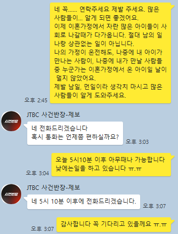 카카오톡 JTBC 사건반장으로 지금 상황을 제보했는데 오늘 전화주신다고 했다.