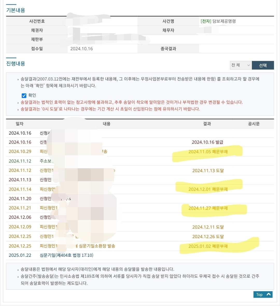 이번주 그 동안 변화가 없던 결과에 속속 폐문부재가 뜨고 있지만! 위의 사건의 경우, 잡것의 1인법인을 찾아내 그 주소로 보냈던것이 "도달"되었다.