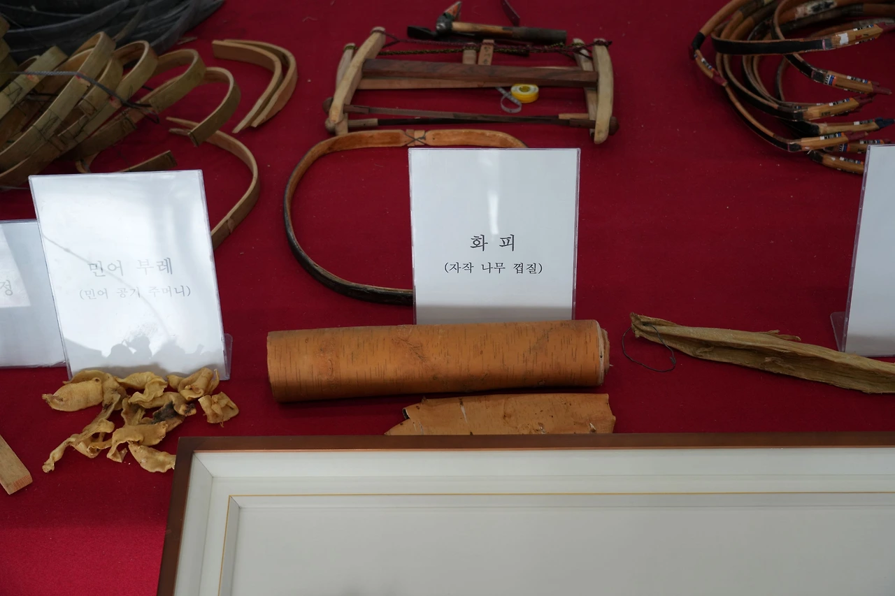 7월 5일부터 7일까지 3일간 열리는 실연 행사였다. 5일은 대나무와 뽕나무 연소 작업, 6일은 물소뿔 펴기 작업, 7일은 해궁 작업 또는 화피 작업으로 진행되고 있었고, 내가 방문한 6일은 비록 화피 작업은 하지 않았지만, 활 제작의 원료인 물소뿔, 대나무, 뽕나무 (아카시 나무), 참나무, 민어 부레 (민어 공기 주머니), 화피 (자작나무 껍질), 소심줄을 전시하고 있어서, 화피가 자작나무 껍질임을 쉽사리 알 수 있었다. 반가운 마음에 김성락 궁시장님께 평소 의문인 벚나무 껍질도 쓰이는지에 대한 질문을 드렸다. 김성락 선생의 답변을 대강 요약하면, “벚(봇나무) 껍질이 자작나무 껍질이다. 우리 나라에 나는 벚나무(봇나무)는 껍질이 얇아서 사용하지 못한다. 북한이나 길림성 등 북쪽의 추운 지방에서 나는 자작나무(봇나무)가 껍질이 굵어서 활을 만드는 데 쓴다. 지금은 주로 중국에서 수입한다.” 정도이다.