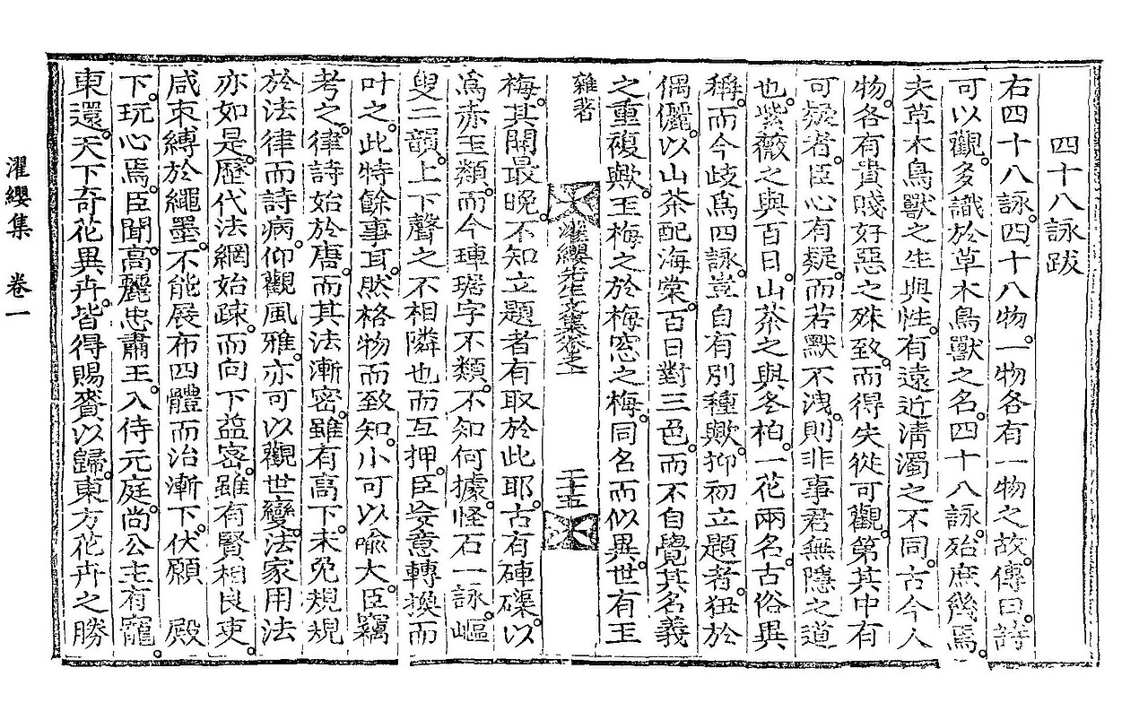 ******* 右四十八詠 四十八物 一物各有一物之故 傳曰 詩可以觀 多識於草木鳥獸之名 四十八詠 殆庶幾焉 夫草木鳥獸之生與性 有遠近淸濁之不同 古今人物 各有貴賤好惡之殊致 而得失從可觀 第其中有可疑者 臣心有疑 而若默不洩 則非事君無隱之道也 紫薇之與百日 山茶之與冬柏 一花兩名 古俗異稱 而今岐爲四詠 豈自有別種歟 抑初立題者 狃於偶儷 以山茶配海棠 百日對三色 而不自覺其名義之重複歟 – 濯纓集 四十八詠跋 (‘一物各有一物之故’는 동어 반복이어서, 앞 문장의 뜻으로 미루어 ‘一詠各有一物之故’가 아닐까 추정해본다.)