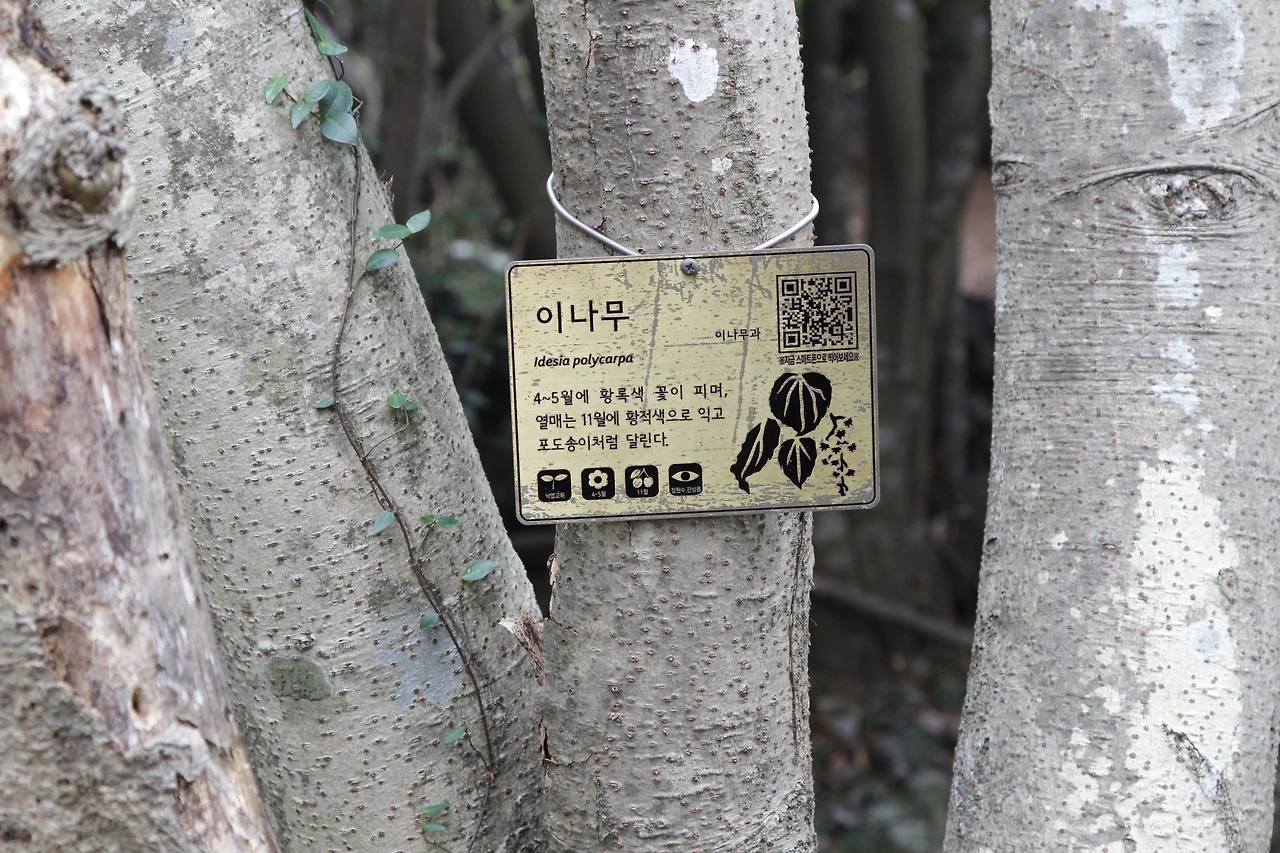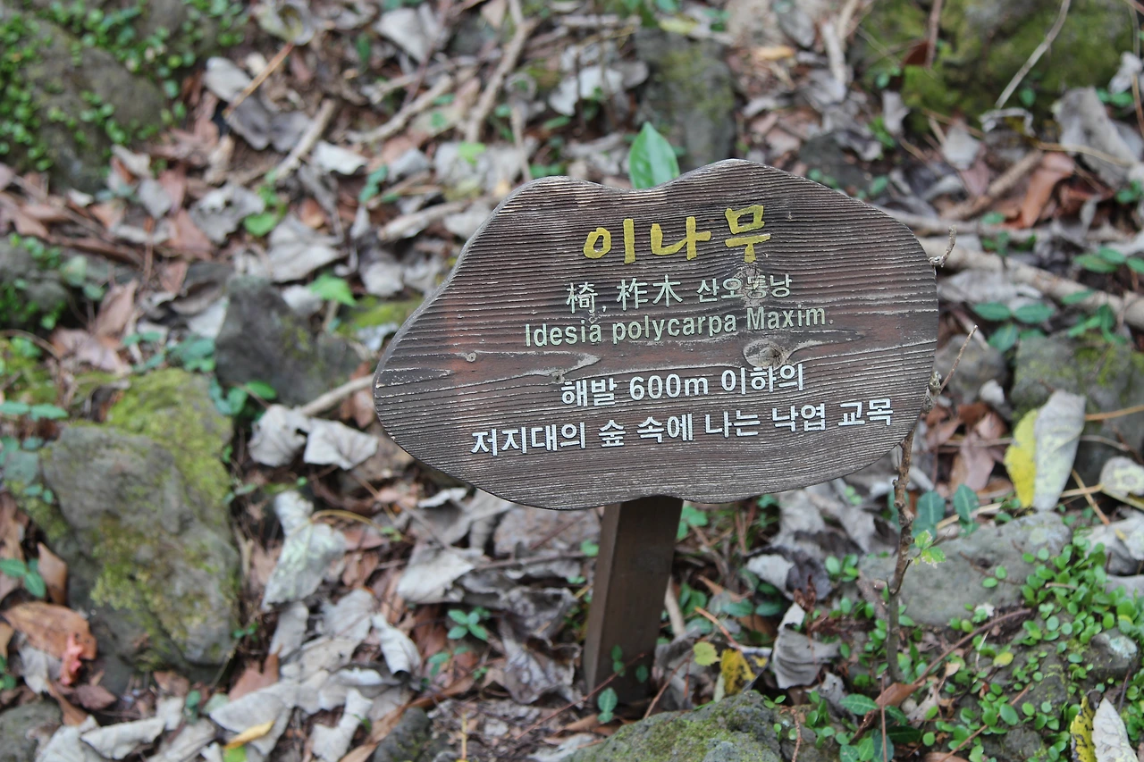 화순 곶자왈에서도 다시 만났는데, “이나무 / 椅, 柞木, 산오동낭 / Idesia polycarpa Maxim. / 해발 600m 이하의 저지대의 숲 속에 나는 낙엽 교목”이라는 팻말을 달고 있었다. 이나무 앞에 이 팻말이 세워져 있었으므로, 이나무를 가리키는 것은 분명했다. ‘산오동낭’은 이나무의 제주도 방언인 듯 했지만, 의椅와 작목柞木이 정말로 ‘이나무’를 뜻하는지 궁금해졌다.