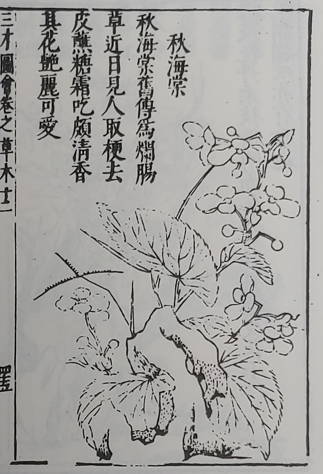 ***** 秋海棠 昔有婦人懷人不見 恒灑淚於北墻之下 後灑處生草 其花甚媚 名曰斷膓花 載採蘭雜志 今之秋海棠是也 - 林下筆記 旬一編