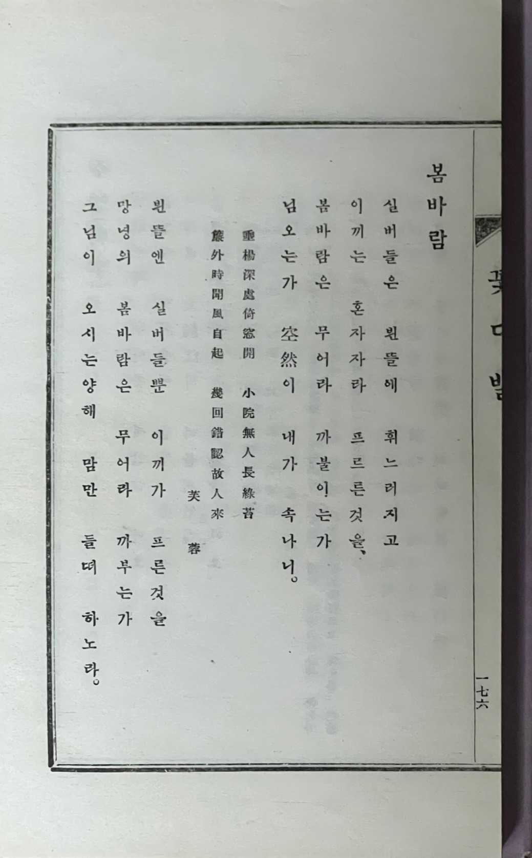 (좌) 1965년 신구문화사 발행, 김억 역편의 한국여류시선집-꽃다발 표지. (우) 성천 기생 부용의 시 '봄바람'