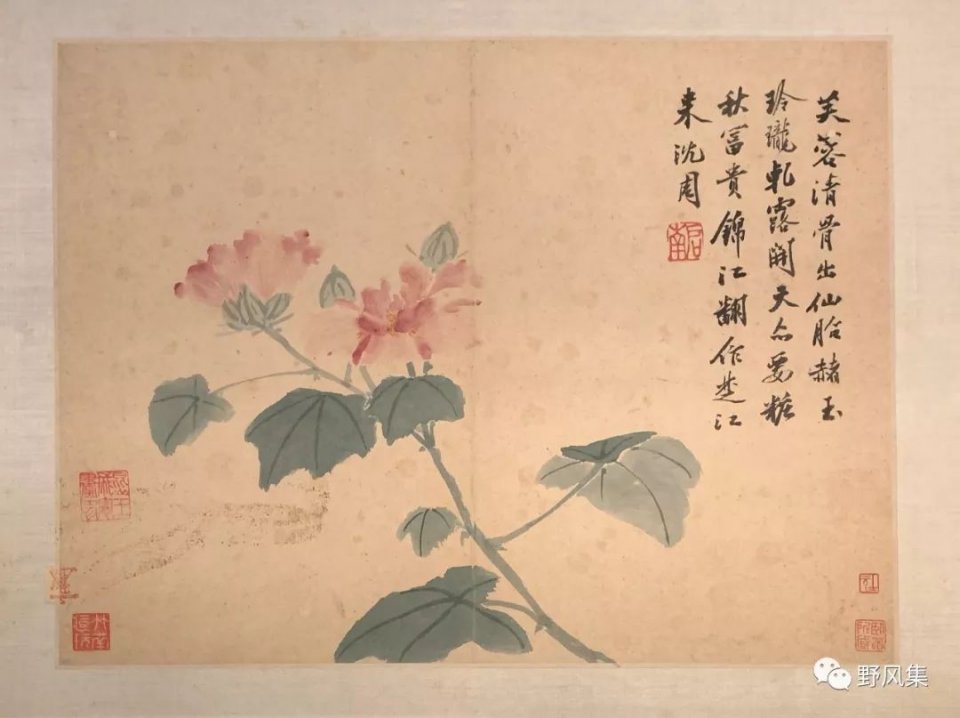 (좌) 부용 - 삼재도회, (우) 산수화훼도 중 목부용 - 신명원 화 (인터넷, 국립중앙박물관 소장)
