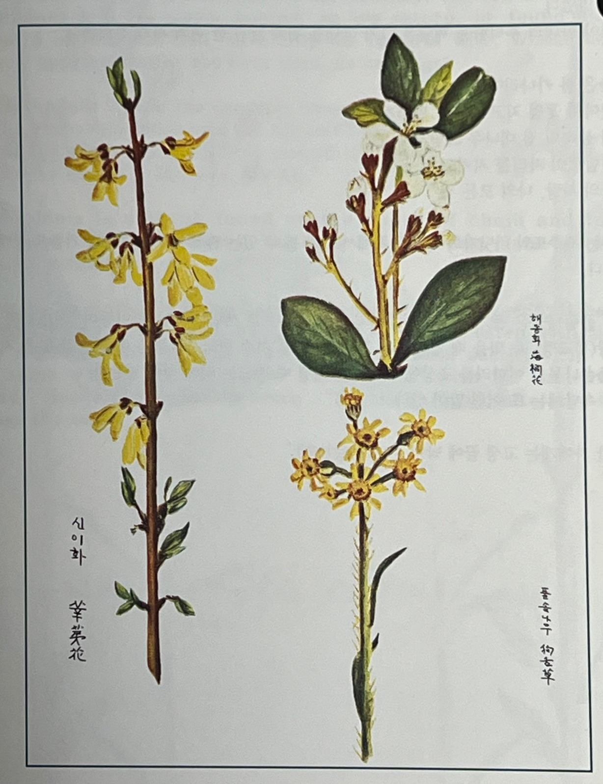 ****辛夷 붇곳 正月二月生花似着毛小桃子色白帶紫當未拆時取之已開者劣 北方地寒二月開花呼爲木筆南方地煖正月開花呼爲迎春” – 東醫寶鑑/湯液篇