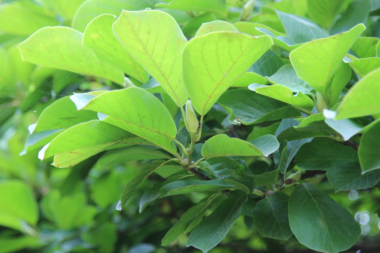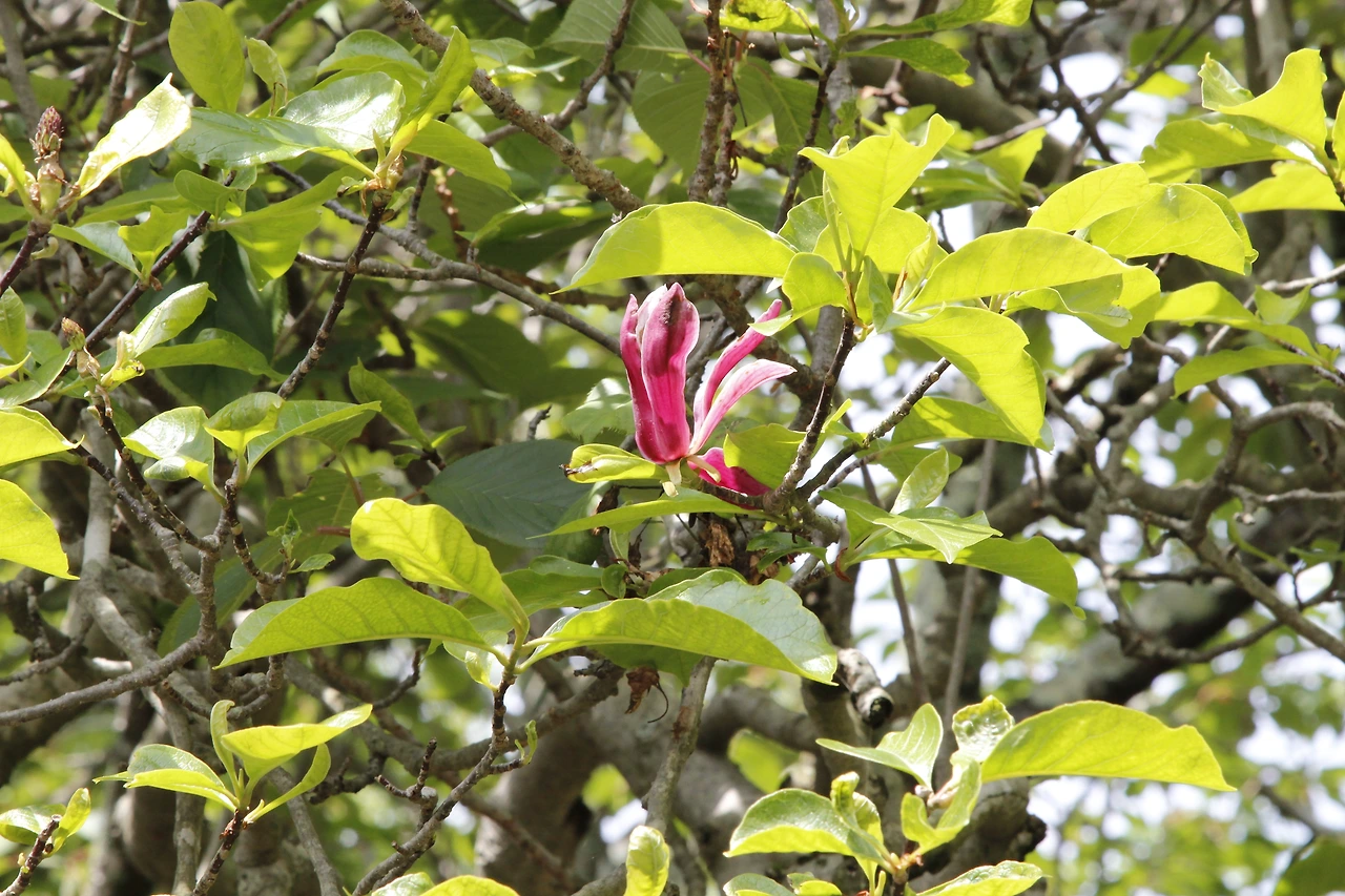 % 신이화로 불렸던 목련류와 개나리는 모두 봄맞이하듯이 이른 봄에 꽃이 핀다는 공통점이 있다. 개나리는 생울타리 격으로 심어진 경우가 많고, 목련과 백목련, 자주목련, 자목련 등 목련류는 대개 정원의 한자리를 우아하게 차지한다. 이 중 화피편 바깥은 자주색이고 안쪽은 흰색인 자주목련은 백목련과 함께 같은 시기에 꽃이 피며 쉽사리 만날 수 있다. 백목련보다 늦게 꽃이 피는 자목련은 상대적으로 귀한 편이다. 나는 안동 체화정에서 몇 차례 자목련 꽃을 감상했고, 2018년 5월 중순 순천 여행에서 뒤늦게 핀 자목련 한송이를 만난 적이 있을 뿐이었다. 지난 7월 3일, 군산에 사는 친구를 보러 갔다가, 꽃은 지고 잎이 무성한 정원에 심어진 귀한 자목련 한 그루를 만났다. 친구 말이, 백목련 꽃보다 2-3주 늦게 자주색 꽃이 핀다고 하므로 이 나무는 자목련이 분명할 것이다. 자목련은 잎이 난 후 여름에 한차례 더 꽃이 피기도 한다고 하여 잎새 사이를 이리저리 보니, 꽃대가 뾰족한 붓처럼 나와 있었다.