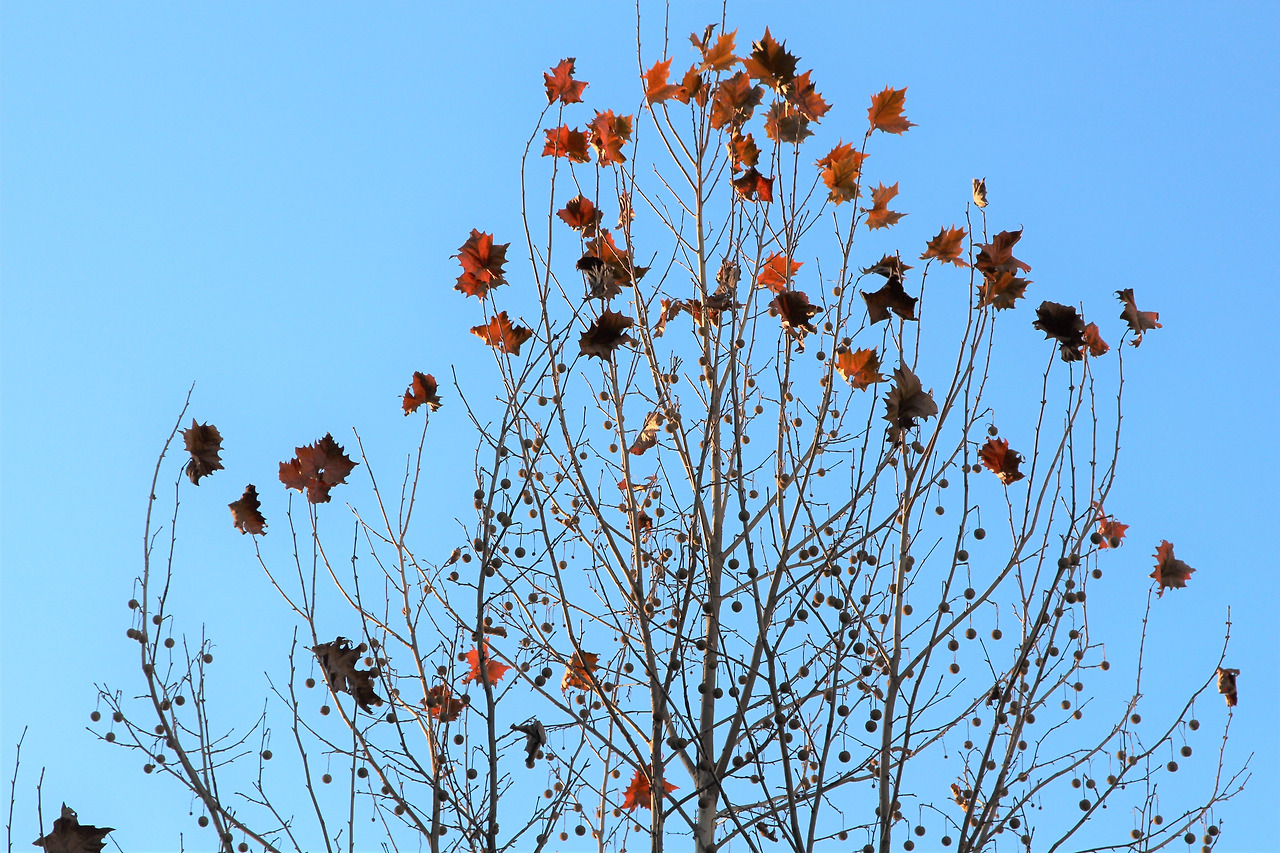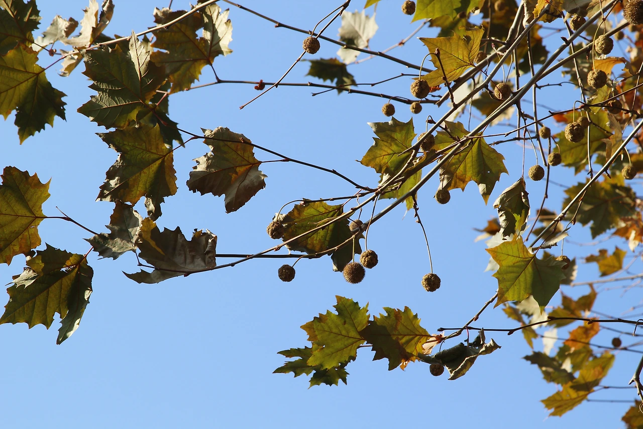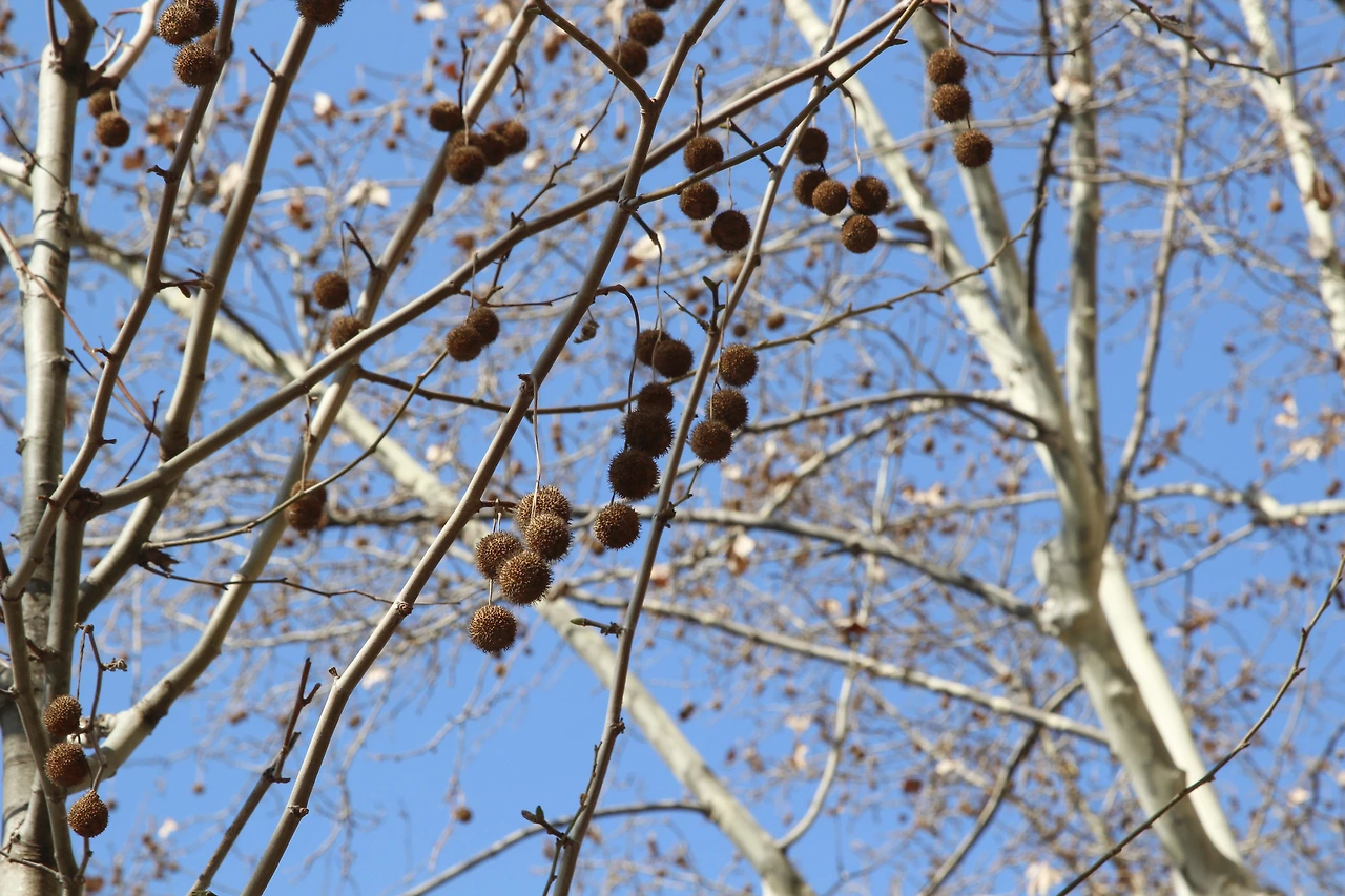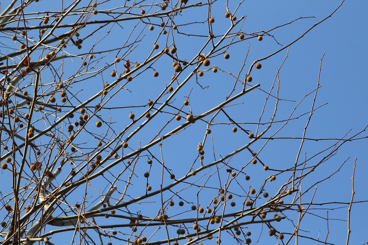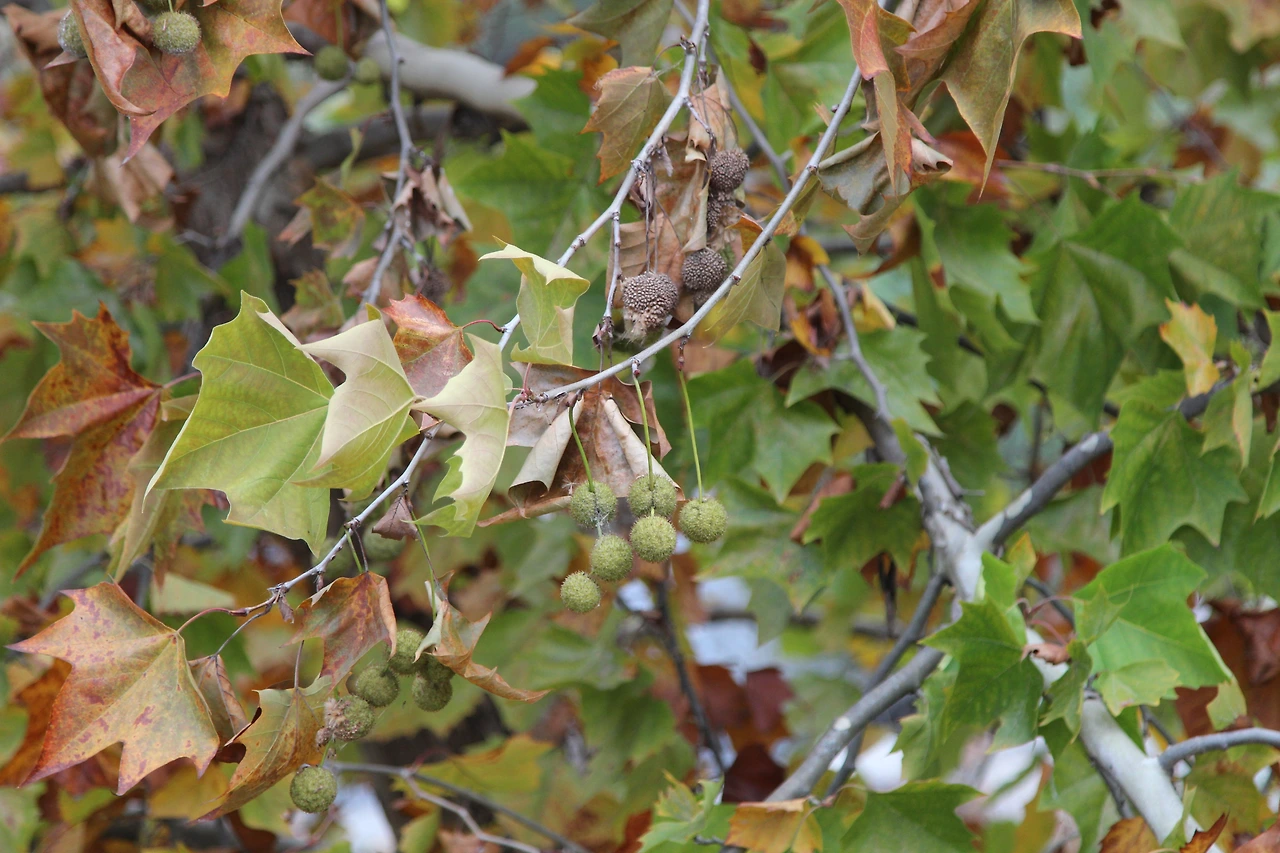 이러 의문을 품고 있다가, 심심하던 차에 내가 찍었던 플라타너스 사진을 살펴보았다. 성남에서 찍은 플라타너스 겨울 사진 중에 열매 2개가 자루에 직렬로 이곳 저곳에 달린 나무가 있었다. 혹시 이게 버즘나무 P. orientalis가 아닐까하고 11월 1일 귀가길에 잠시 예의 사진 촬영장소로 가서 다시 관찰해보았다. 확실히 열매 방울 2개를 달고 있는 곳이 많았고, 몇 곳은 자루 하나에 3개까지 연결되어 있는 것이 아닌가? 잎은 양버즘나무와 유사한데 일부 잎은 결각이 더 적고 깊다. 그렇다면 이 나무는 버즘나무와 양버즘나무의 교잡종인 단풍버즘나무 (Platanus x hispanica Miller ex Munchhausen***)일 가능성이 크다. 내가 드디어 도감에서만 보던 단풍버즘나무를 감상한 것이다. 내 나무 선생님에게 확인해보니 거의 확실하다고 하신다. 기쁘다!