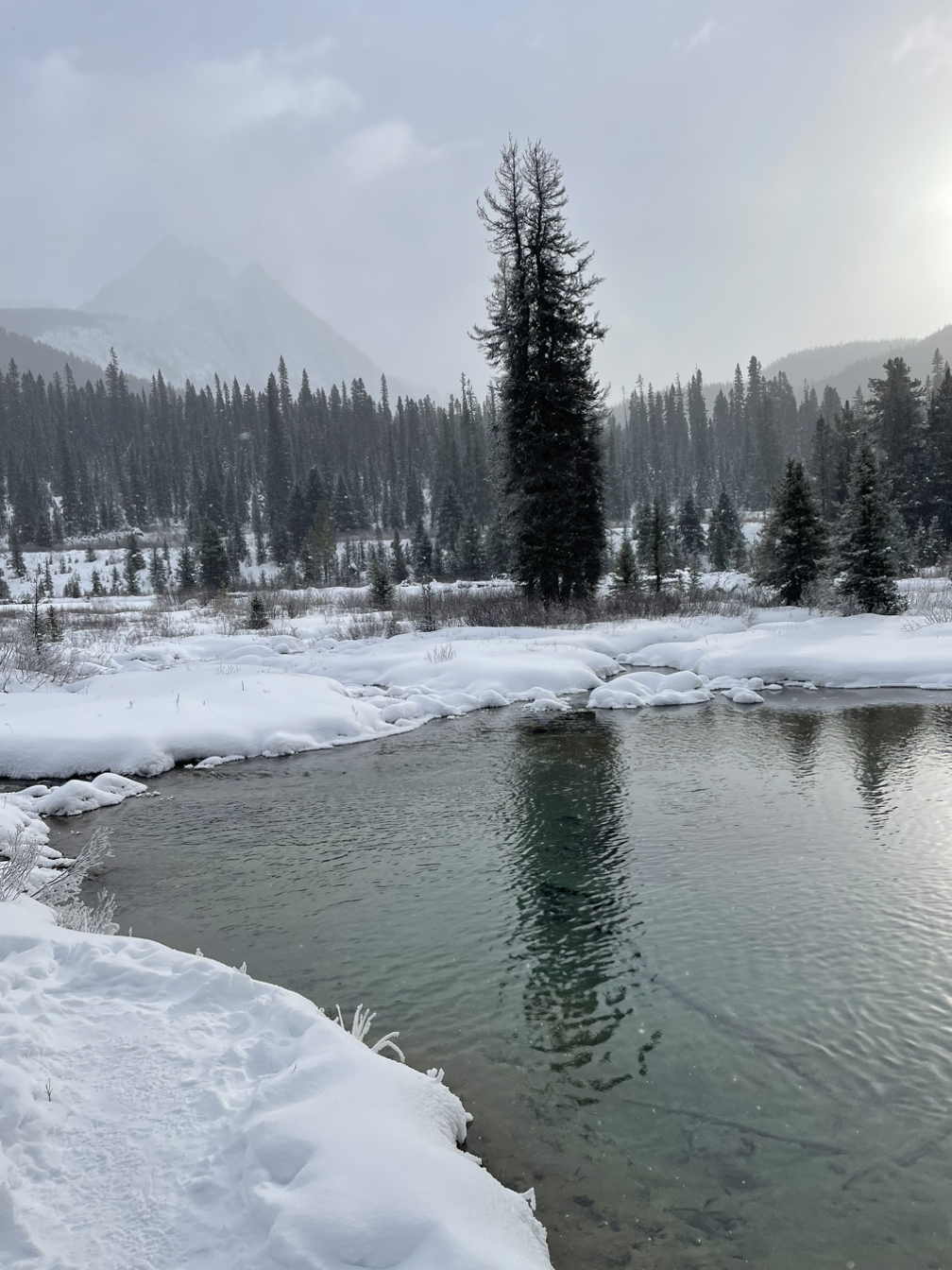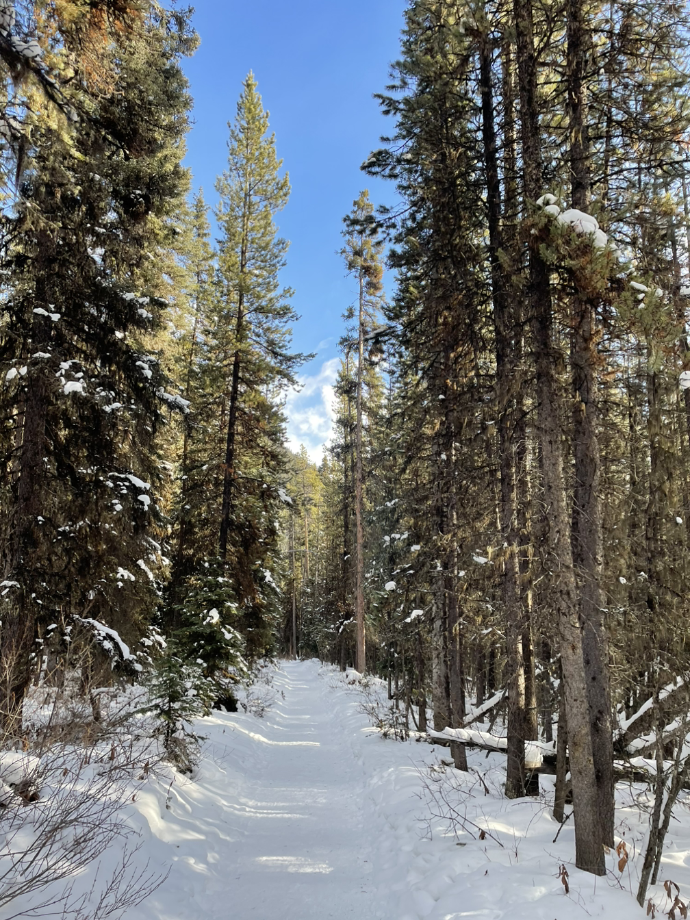배도 부르고 탁 트인 공간에서 주변을 둘러싸고 있는 로키의 봉우리들을 감상하고 있으려니 참 행복이 지금 여기 있다는 생각이 들었다. 그래도 떠나야 하니 사진 찍고 하산. 눈 쌓인 고요하고 평화로운 숲길을 또다시 걸었다.