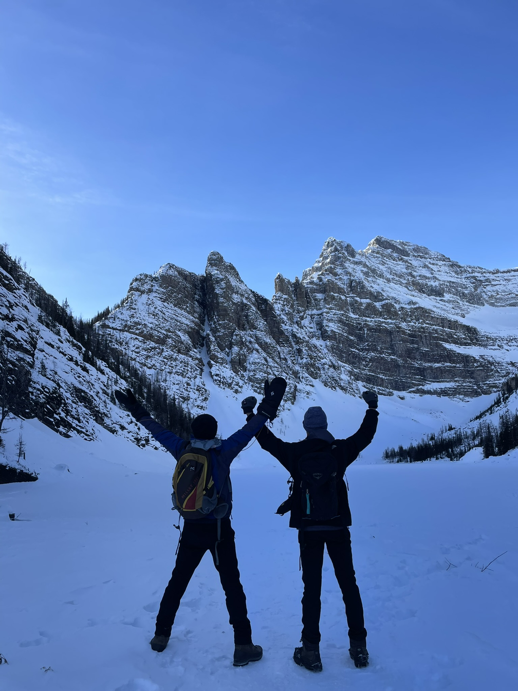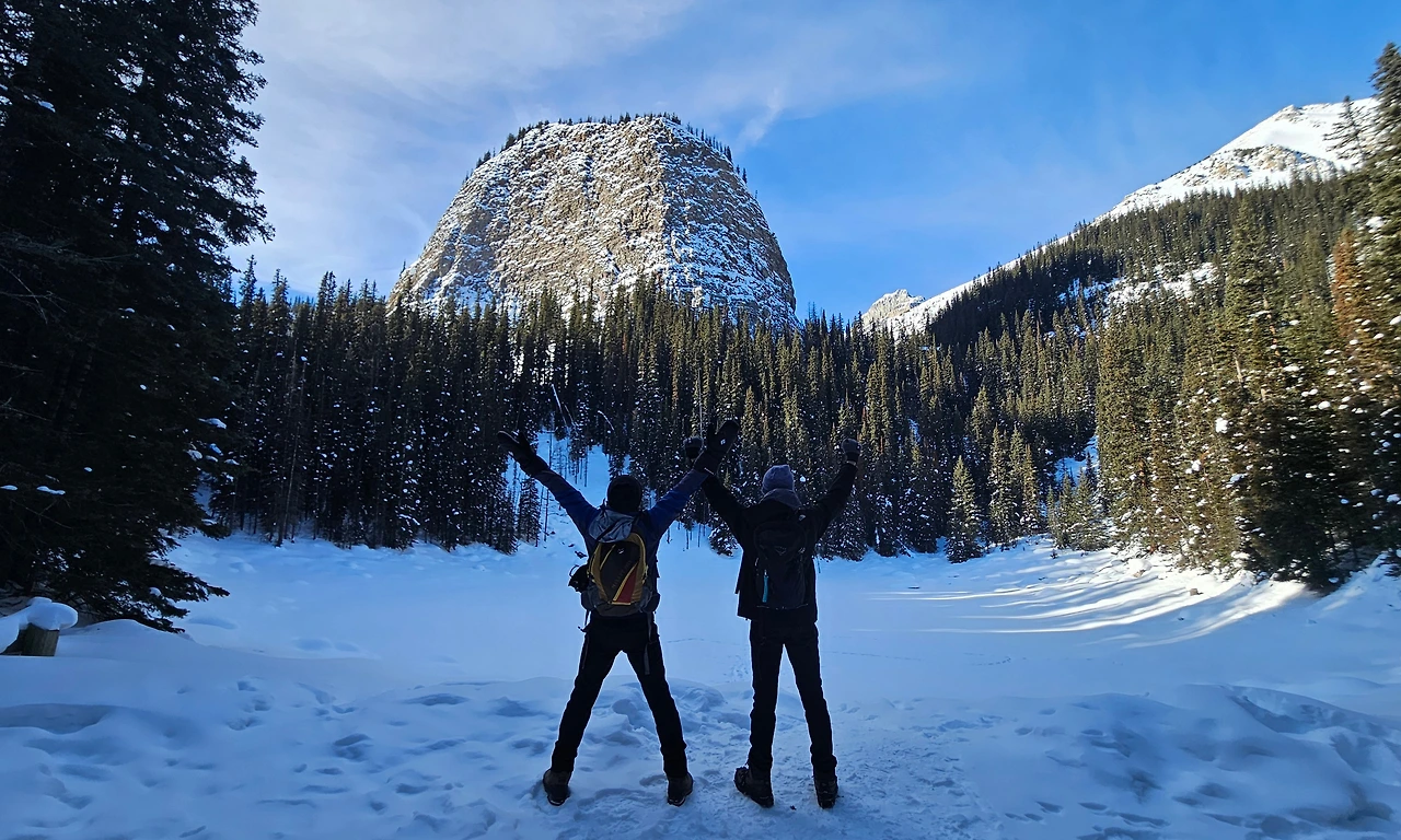 이렇게 저렇게 오르다 보니 깜짝 놀랄 풍경이 나타났다. Mirror Lake. 아담한 연못 수준의 호수였는데 역시나 얼음 위에 하얀 눈이 쌓여 있는 것은 앞서 본 Lake Louise와 다를 게 없었다. 그러나 호수 뒤에 우뚝 솟은 봉우리는 우리를 압도하며 정말 만화 속 풍경을 만들어 주었다. Big Beehive. 만세를 부르는 자세로 돌아가며 사진 찍고 호수도 밟아 보고 단체사진도 찍었다.