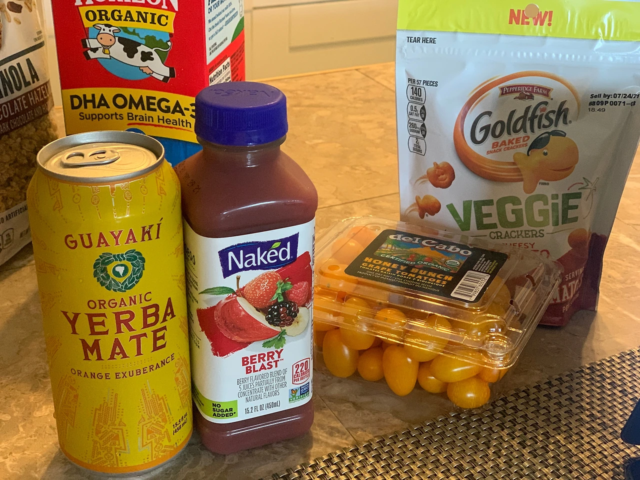 - 물, 베리 블래스트 주스, 오렌지 마테 티 음료