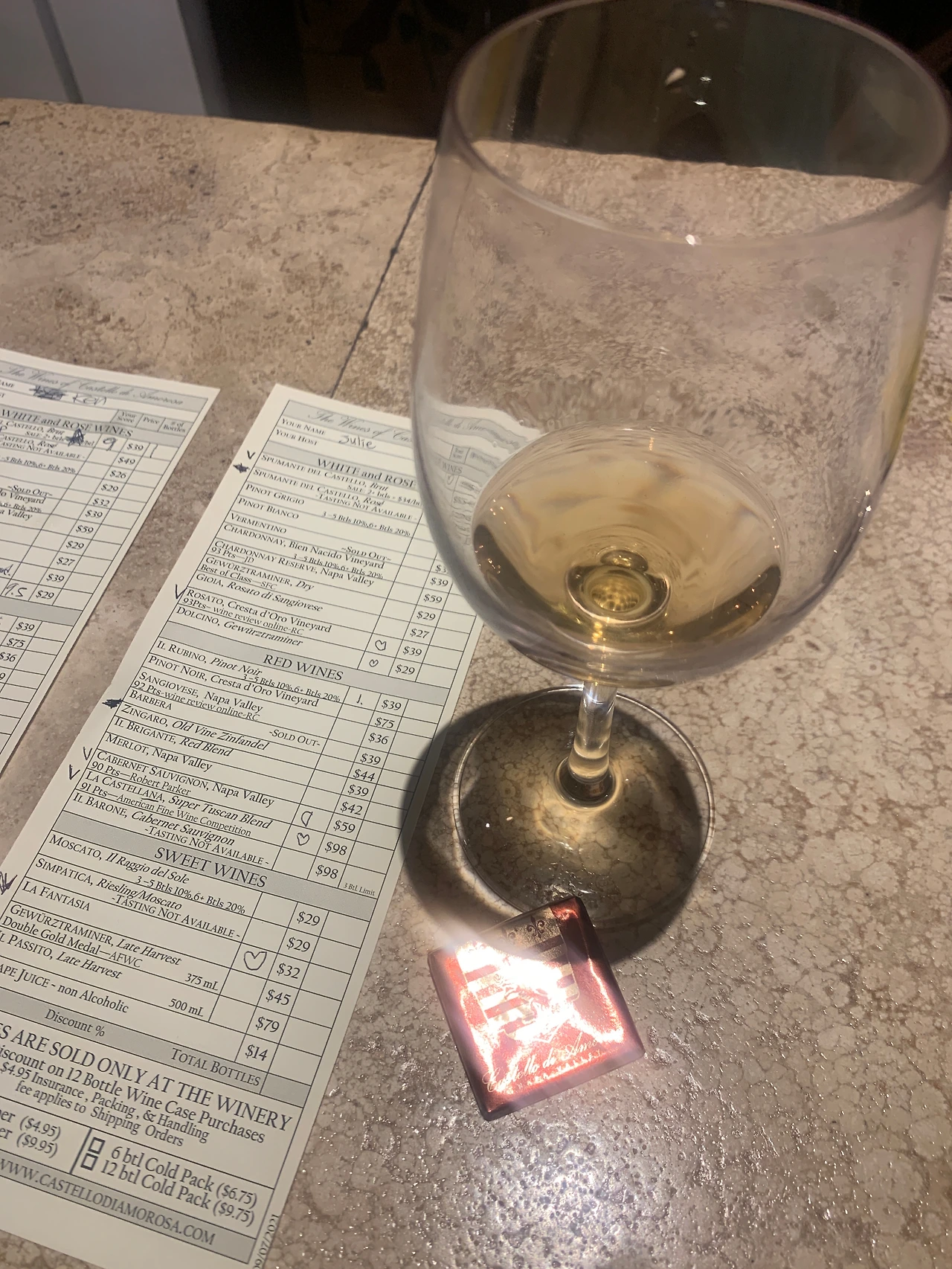 소믈리에 할아버지가 마지막에 달달하고도 진한 와인을 마실 때 씨 쏠트 다크 초콜릿 하나를 내어주셨는데 가르쳐주신 대로 와인 한 모금, 초콜릿, 그리고 다시 와인 한 모금의 순서로 먹으니 금상첨화였다.