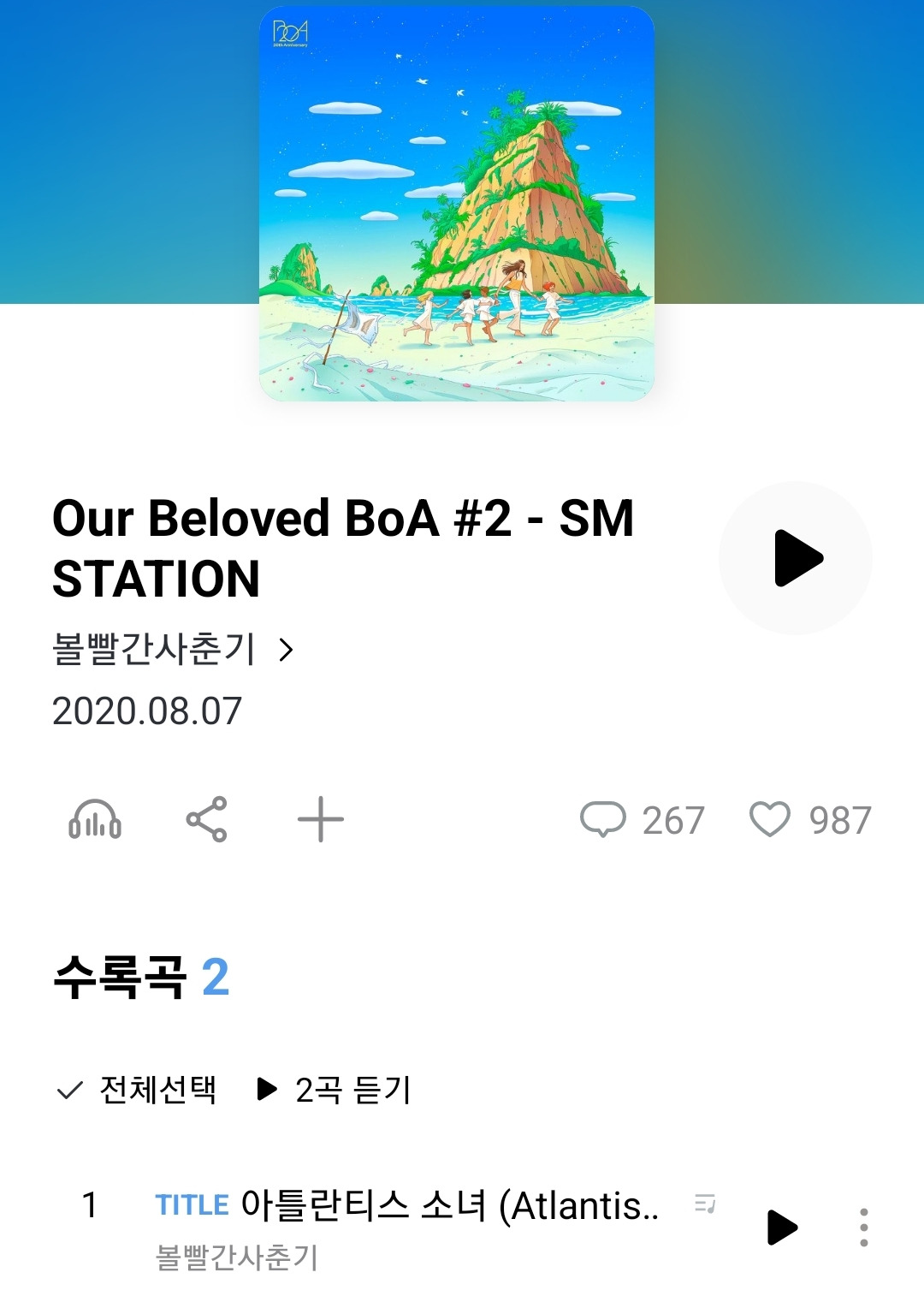 그리고 2020년 8월, 보아의 아틀란티스 소녀는 볼빨간사춘기라는 가수에 의해 커버되었다. 그 당시 나는 아직 고등학생이었고, 중학생 때부터 듣던 볼빨간사춘기 특유의 음색을 여전히 좋아했다. 커버된 곡은 내가 듣기에 너무도 좋았고, 나는 그 노래로 인해 원곡을 찾아 듣게 되었다. 안타깝게도 내 귀엔 볼빨간사춘기 버전이 좀 더 마음에 들었지만 말이다.