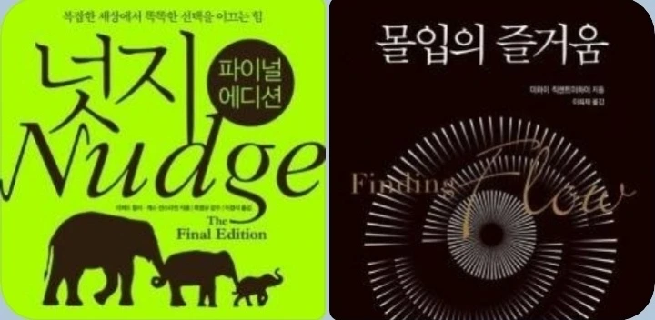 그중에서 가장 도움이 된 것은 '넛지'와 '몰입의 즐거움'이라는 책이었다. 둘 다 여러 풍부한 내용과 주제를 다루는 책이지만, 오직 습관과 실천에 바탕을 두어 나에게 적용시켜 보았다.