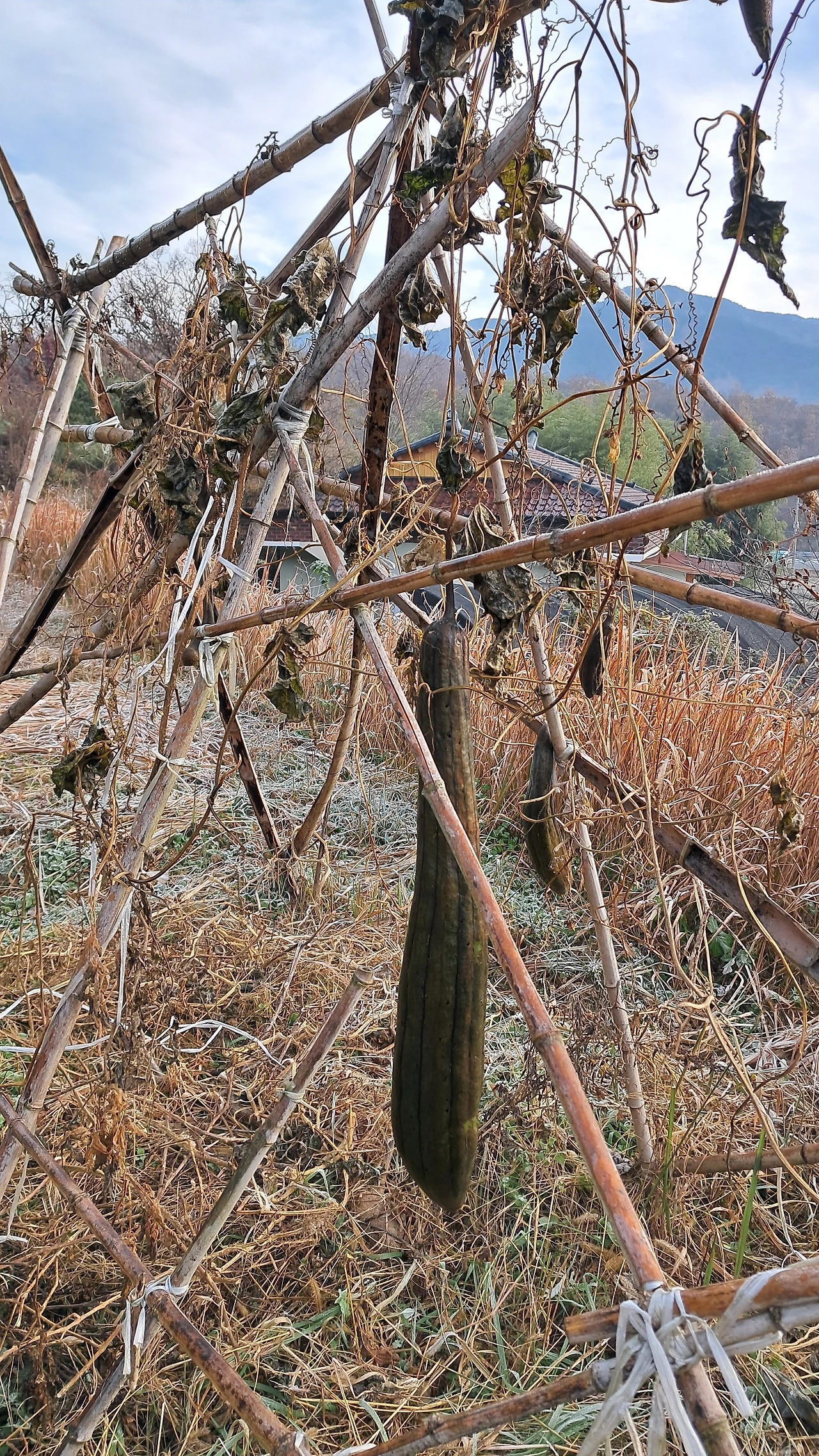 텃밭에는 무와 배추가 많이 자라 수확하는 철이다. 이 시기에는 잡초들도 모두 힘을 잃고 누렇게 쓰러져 있었다. 급하게 닥칠 추위에 대비해 스카이로켓 향나무에는 벼과식물로 멀칭해 주고, 단풍이 들기 시작한 블루베리에는 솔잎과 가지로 잘 덮어주었다. 방울토마토와 자연적으로 자란 수세미도 잎을 모두 떨구어 황량한 모습이었다. 다음 날이 되니 첫서리가 내리고 물통의 물이 얼었다.