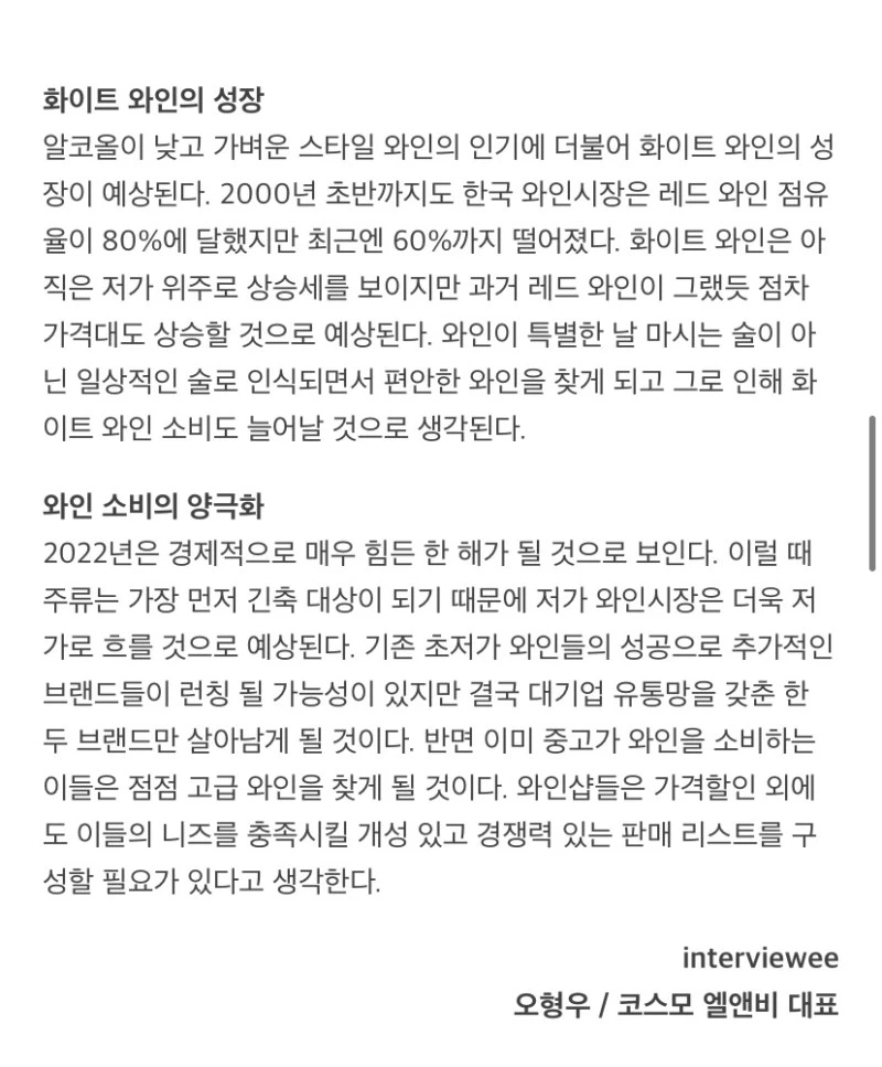 한국 사람 화이트 와인 선호도가 높아졌다는 게 나 혼자만의 이론이 아니라 전문가들도 이렇게 말하고 있으니, 앞으로 브리핑에서 한국 사람은 레드와인만 마신다!라고 말할 일은 없을 것 같다.