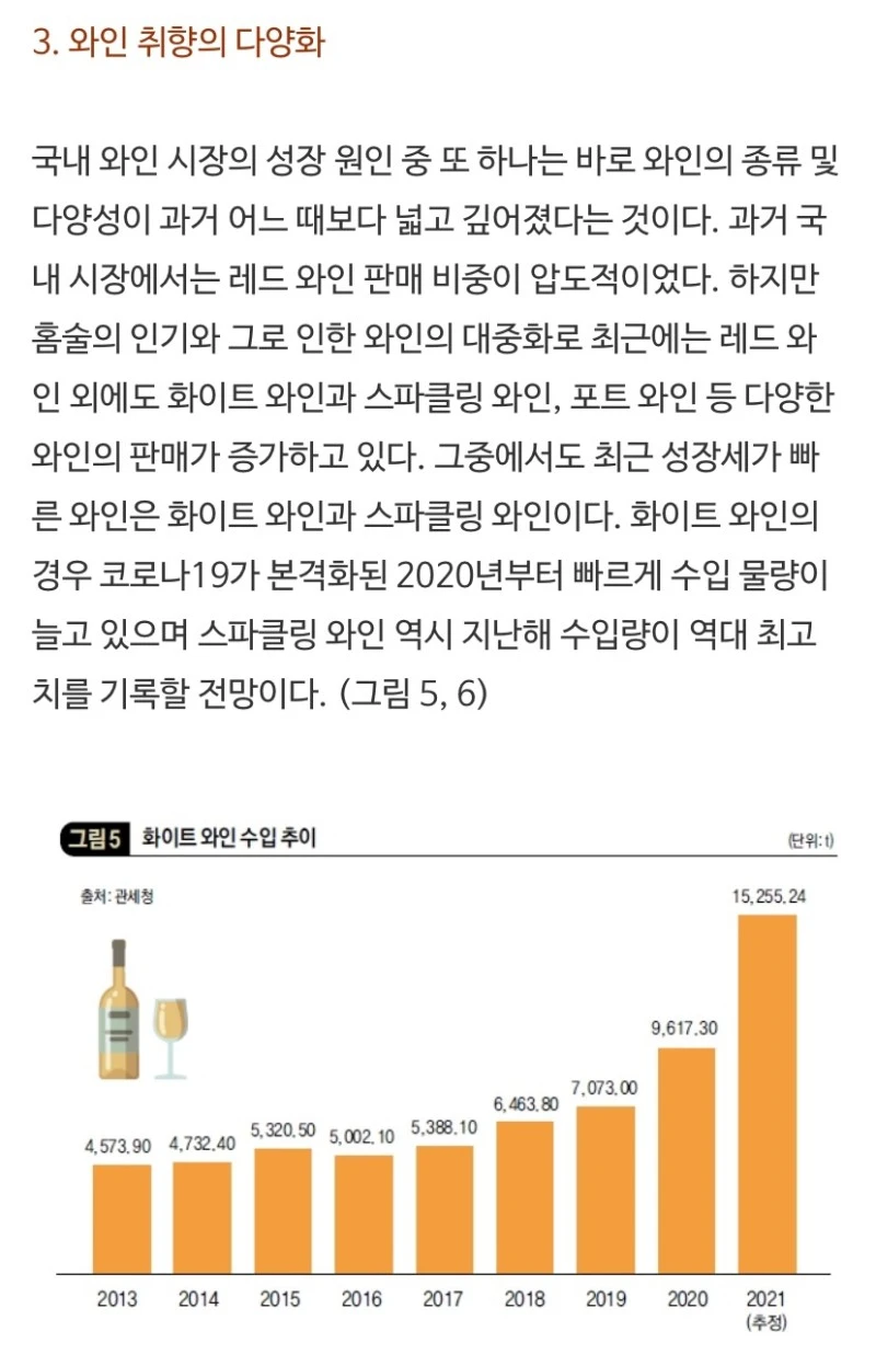 주세법 개정과 더불어 코로나로 인해 홈술, 홈파티 족이 늘면서 국내 와인시장이 활성화되었고 그로 인해 취향이 다양해지며 화이트 와인의 소비가 늘었다는 것! 화이트 와인이 레드 와인보다 입문용으로 선호되어 소비가 늘었다는 내용도 있었다.
