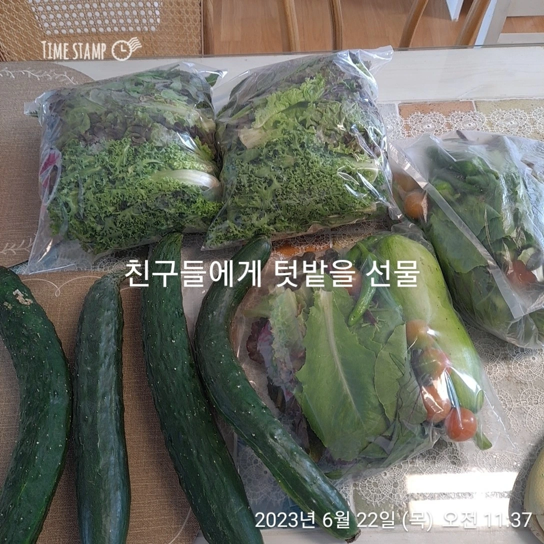 제일 처음 텃밭에서 맺은 오이는 이사 온 지 얼마 안 되어 식사를 초대해 준 지인에게 전달했다. 여러 채소를 가지런히 비닐 포장하고, 기다랗고 푸른 오이를 봉투에 함께 넣었다. 채소 종합세트를 선물로 받은 지인의 표정은 그야말로 친정어머니께 받은 사랑처럼 감격해했다. 그것도 처음으로 딴 오이라는 사실에 고맙다는 말을 여러 번 했다. 첫 열매라는 의미가 제법 큰 것 같다.