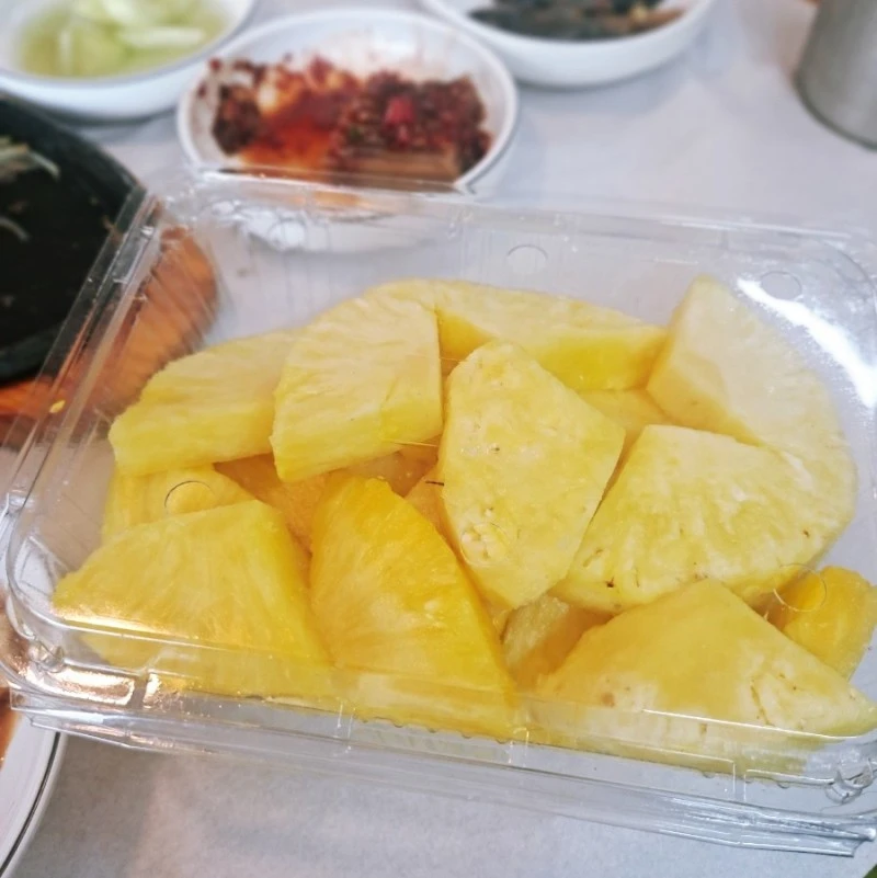 파인애플 두 개를 깎아 통에 담아 온 과일 장수 아저씨는 감사하다며 총총 사라졌다. 오른쪽에 앉은 모녀는 상술을 미리 차단해 과일 장수가 얇게 썰어 준 파인애플을 지혜롭게 거절한 터다. 쌈용으로 식탁에 올려진 넓은 깻잎을 한 장 들어 그 위에 파인애플 네 조각을 올리고 옆으로 전달했다. "너무 많아서요" 옆에 앉은 7번 테이블 딸이 어떻게 해야 할지 고민하니, 맞은편 엄마가 감사히 두 손으로 받는다. 함께 후식을 나누니 이 식당 점심이 더 즐거워진다.