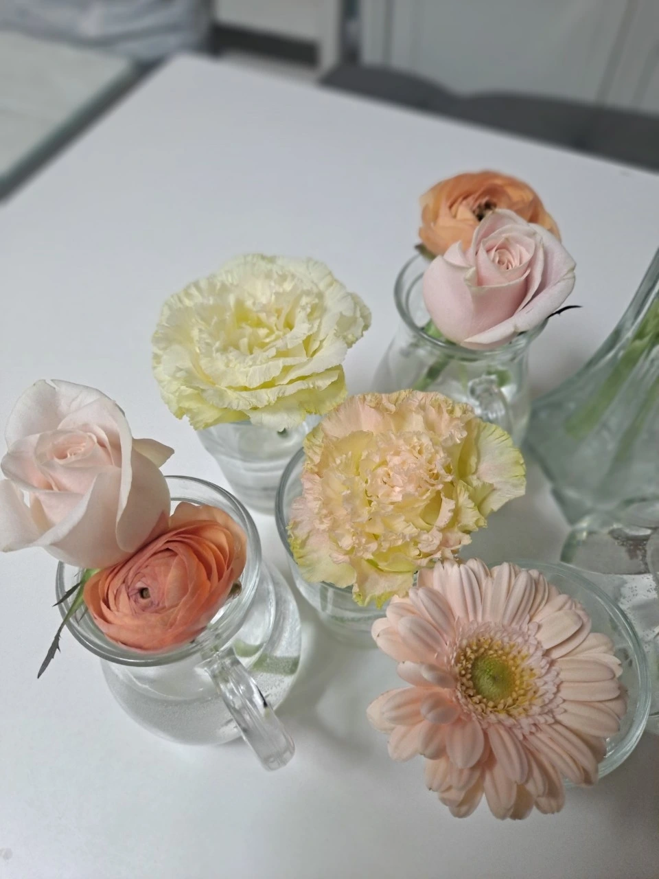 최근에 가장 효과를 봤던 인테리어는 꽃에 대한 것이다. 작은 물컵에 꽃머리가 뚜껑처럼 덮어지는 길이로 짧게 잘라 식탁에 놓았다. 식사하는 내내 멋진 분위기를 만들었다. 여섯 개의 키 낮은 물컵에 담은 꽃은 손님맞이가 끝난 후에도 화려한 집안을 만들어주었다. 일주일 내내 꽃병을 모듬어도 두고, 흩어도 놓아서 예쁜 공간이 되었다.