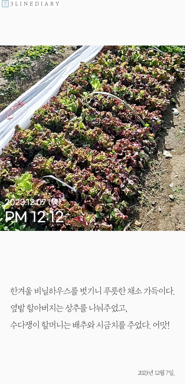 "오랜만이네. 배추 뽑을 때 주고 싶었는데 안보이데."