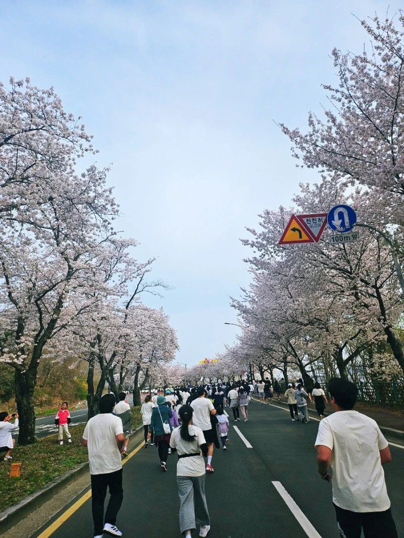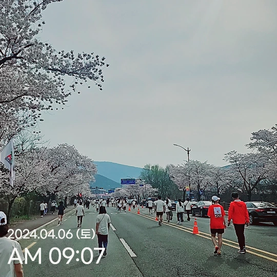 올해는 날짜에 맞춰 벚꽃도 만개했다. 양옆으로 끝없이 펼쳐진 가로수 흰 벚꽃 아래를 뛰고 걷는다. 꽃길만 걷는 순간이다.