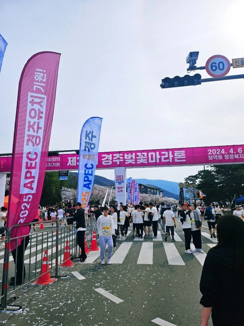 경주 엑스포 공원 입구에 벚꽃 마라톤 안내 깃발과 현수막이 가득하다. 들썩이는 음악에 머리는 지끈거리지만, 졸리던 눈은 다양한 사람들을 구경하며 초롱초롱해진다.