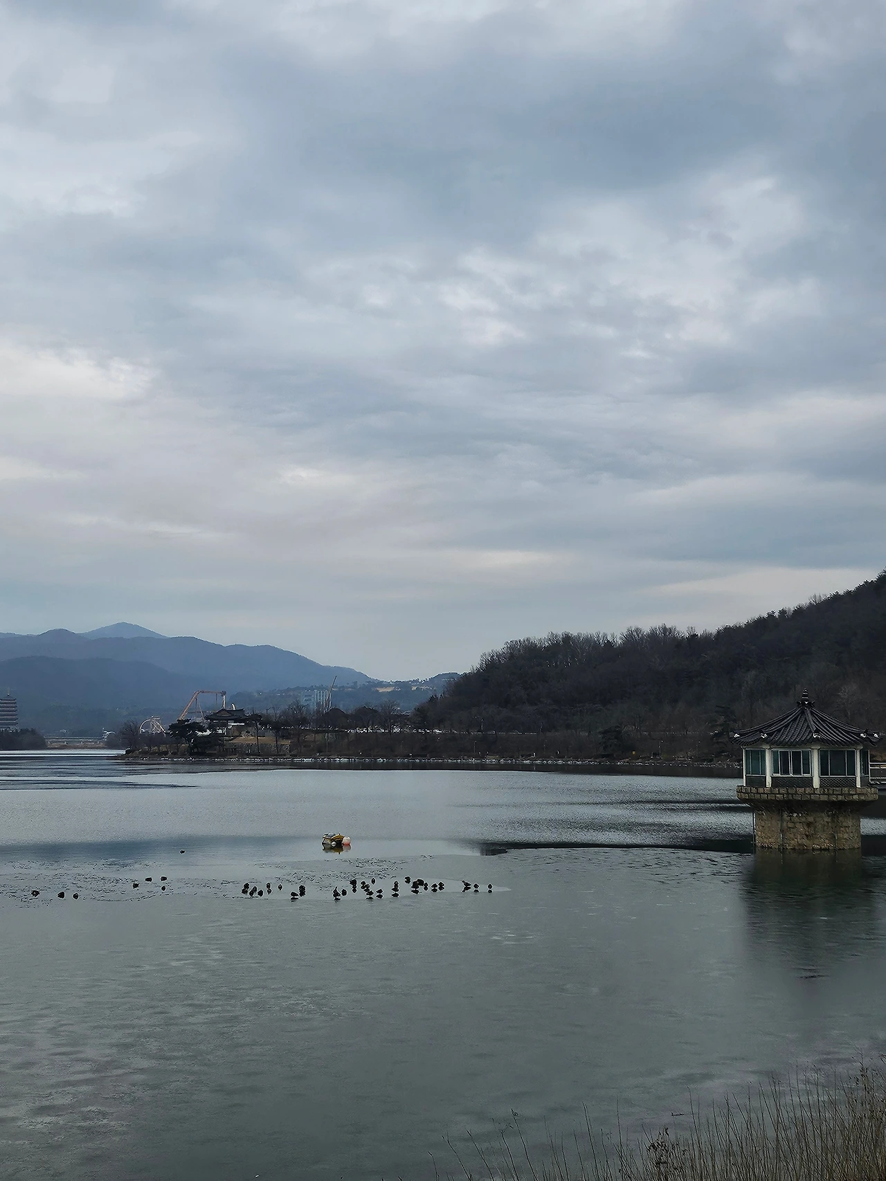 장갑을 끼고 털모자를 눌러썼다. 무릎까지 덮는 오리털 파카 덕분에 찬바람도 괜찮을 것 같다. 차 문을 열고 밖으로 나서자 찬 공기가 콧속 깊숙이 훅 들어왔다. 오랜만에 호수 한 바퀴를 돌 생각에 한숨이 먼저 나온다. 한 시간 반, 힘차게 걸어보자.