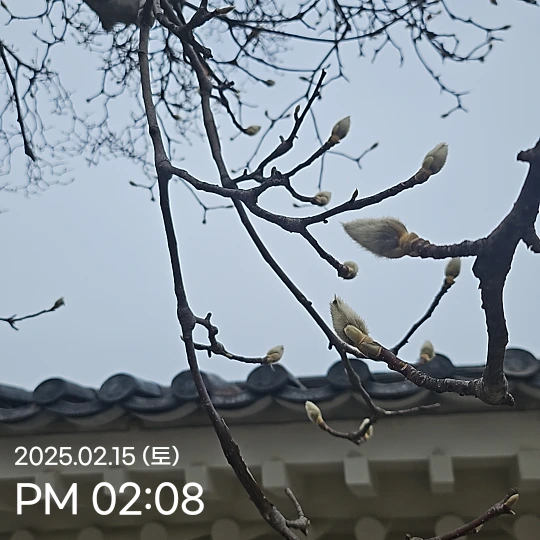 호수 입구 근처, 기와 얹은 담벼락에 뭉툭한 덩어리들이 보였다. 가까이 가서 보니 갈색 털옷 입은 목련 봉오리다. 뽀송한 겉옷 속에 감춰둔 하얀 꽃잎. 3월이면 새하얀 이파리를 우아하게 펼쳐 보이겠지.