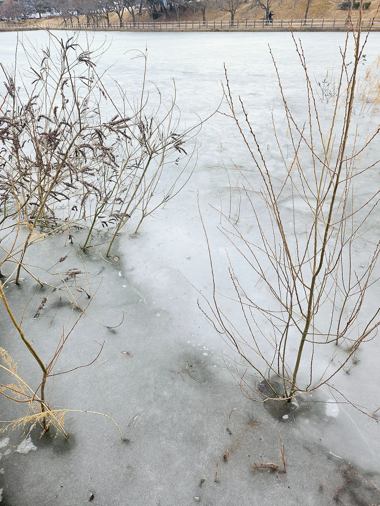 징검다리를 건너고 힐튼 호텔 앞 나무다리를 건너려다 멈췄다. 다리 밑은 하얀 얼음이 꽝꽝 얼어 있다. 넓게 펼쳐진 얼음장.