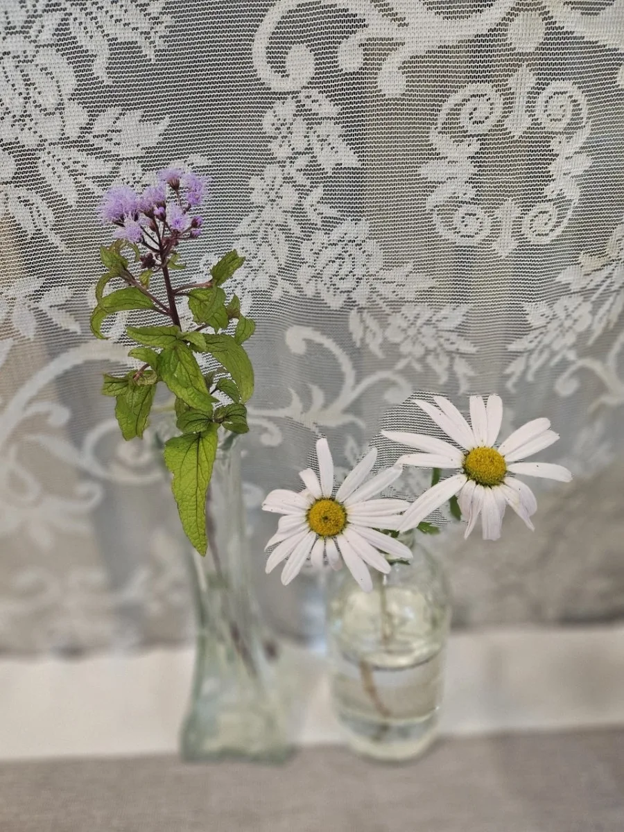 4월에는 하얀 불두화, 5월이면 보라색 수레국화와 새빨간 양귀비, 6월이면 분홍 달맞이랑 노란 루드베키아, 여름엔 범의꼬리, 가을이면 코스모스. 계절이 바뀔 때마다 들에서 한 두 송이 꽃을 꺾어 집에 들였다. 음료를 비운 예쁜 병을 씻어두었다가 꽃 한 송이씩 꽂아 식탁에 늘어놓곤 했다. 못 말리겠다는 표정의 딸과 남편의 웃음.