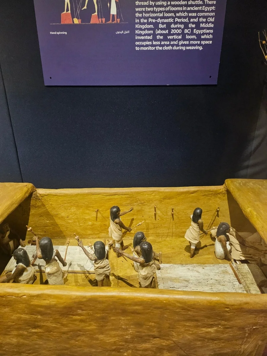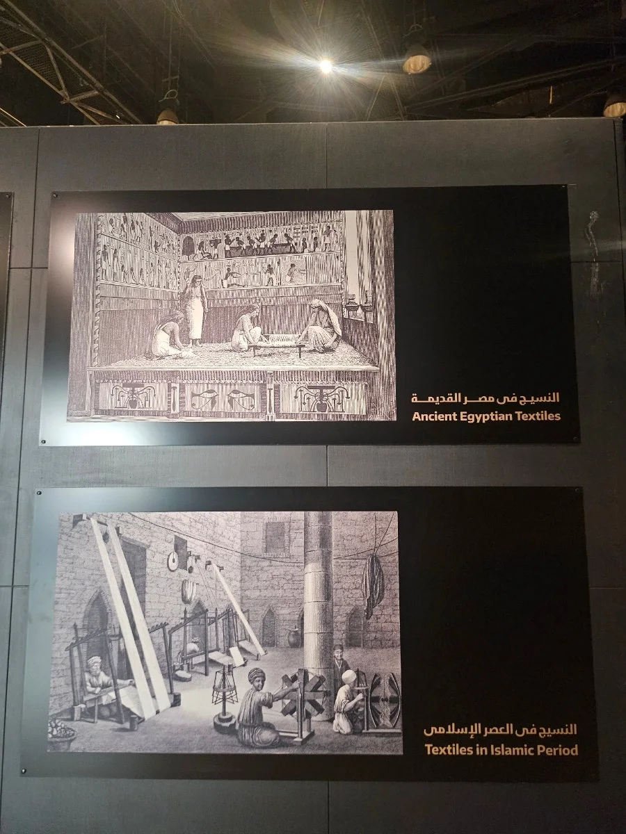 문명 박물관 섬유관에 들어섰다. 2층으로 이어지는 전시관에는 고대 이집트의 섬유 역사부터 현대 의류에 이르기까지의 연대기 순으로 펼쳐져 있었다. 입구에는 고대 여성들이 물레를 돌려 실을 뽑고 직조하는 모습 그림이 전시되었다. 이슬람 시기의 장면도 볼 수 있었다.