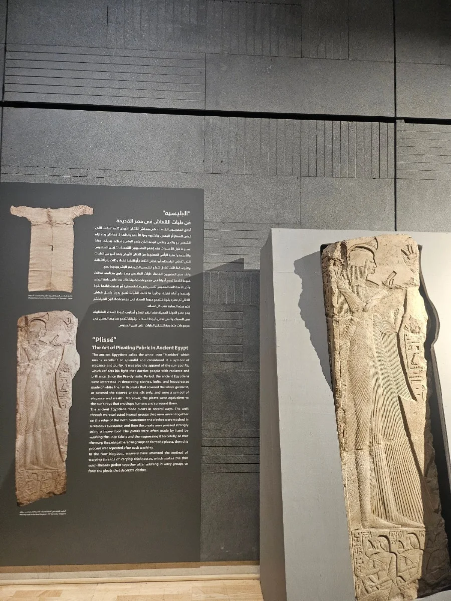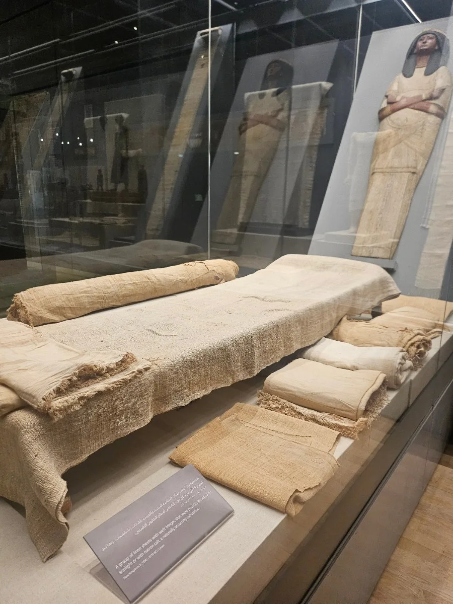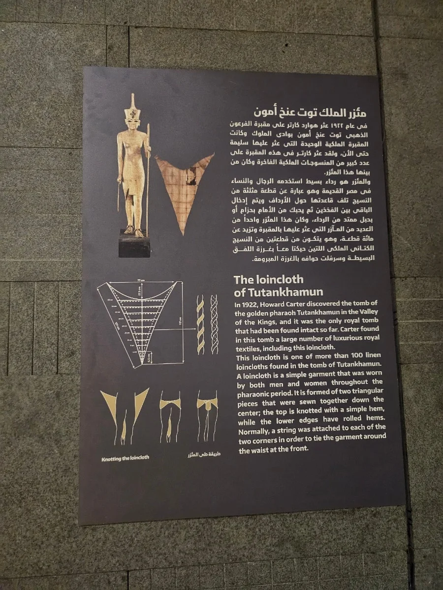 유리관 속 한편에는 투탕카멘 무덤에서 출토된 허리천(로인 클로스)이 전시되어 있었다. 가로 77cm, 세로 95cm의 삼각형 리넨 천은 허리에 묶어 착용하는 속옷 형태로, 실용성과 편안함을 갖춘 고대 섬유의 일면을 보여준다. 놀랍게도 이 무덤에서 같은 형식의 허리 천이 100점 이상 출토되었다고 한다. 이는 섬유가 고대 이집트에서 얼마나 중요한 자산이었는지를 시사한다.