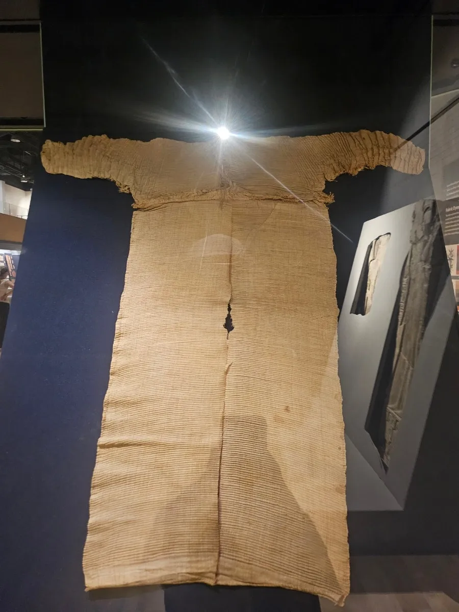 바로 옆 유리관 속에는 삼베처럼 보이는 긴팔 원피스가 눈길을 끌었다. 특히 상의 소매 부분에 정교하게 잡힌 주름은 감탄을 자아냈다. 고대 이집트 의류에 이미 주름 가공 기술이 적용되어 있었던 것이다. 상의 전체에 잔잔히 들어간 주름은 마치 정성스레 누빈 옷처럼 품위 있는 인상을 주었다.