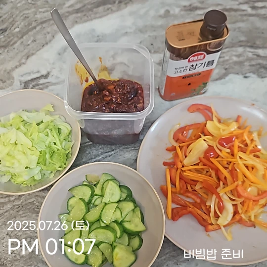 아직 한국에서 도착하지 못한 예쁜 냉면기가 아쉽다. 분홍빛 볼에 흰밥을 담고, 볶은 채소를 둘러 얹었다. 중앙엔 고추장 볶음을 올리고 참기름과 깨를 흩뿌리니 이집트식 비빔밥 완성이다.