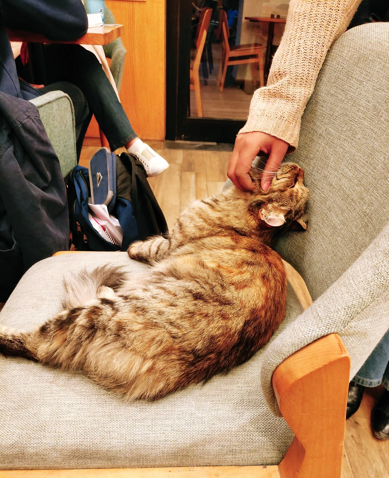 그 모습이 예뻐 보였는지, 짐을 챙겨 나가려던 히잡 쓴 여성이 한참이나 녀석을 바라본다. 조심스레 손을 내밀어 머리를 쓰다듬자 고양이는 눈을 지그시 감고 고개를 뒤로 젖힌다. 웃음을 참으며 곁눈질 중. 호감과 애정은 말 없어도 전해지는 모양이다. 눈빛과 손길, 그리고 공기로도.